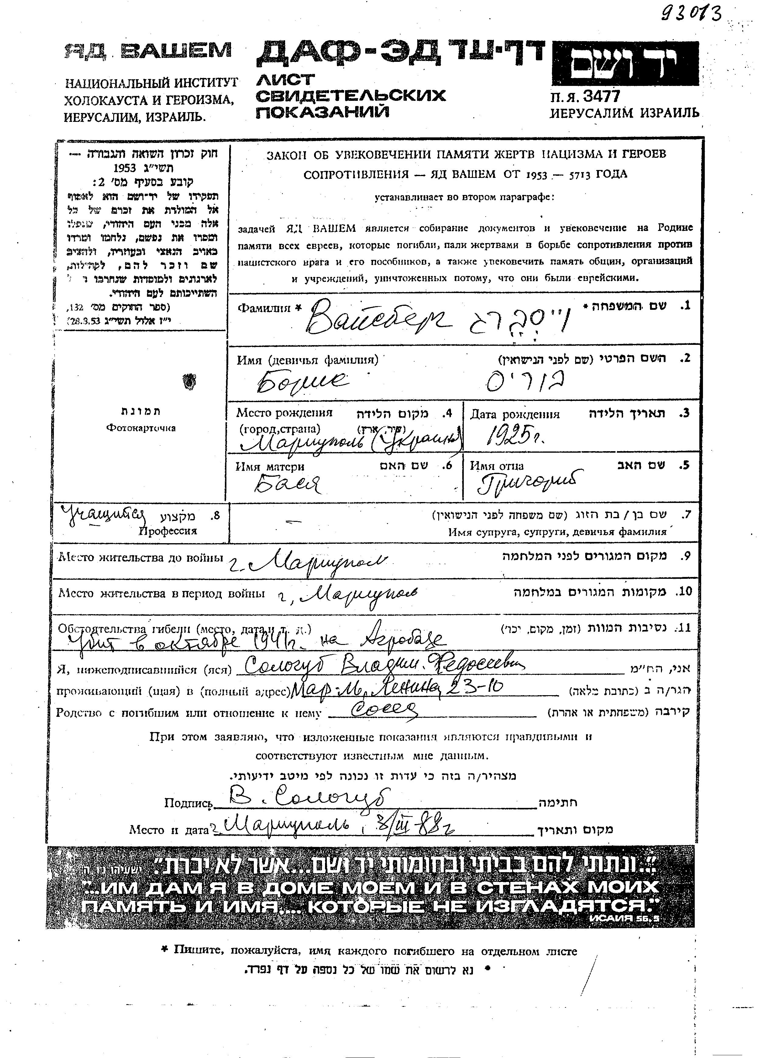 Vaisberg Boris 1925 Mariupol, Ukraine (URSS) Feuille de témoignage