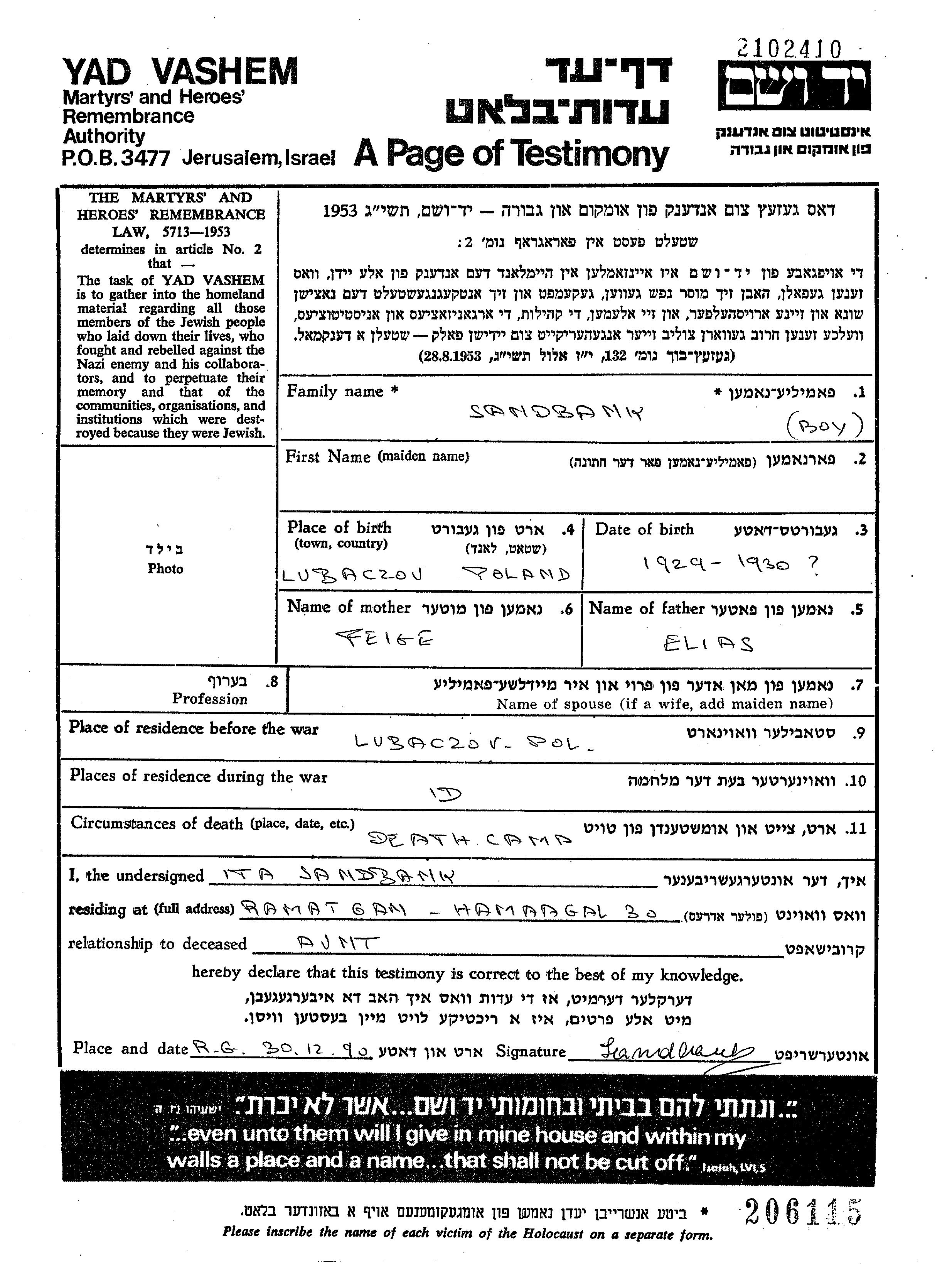 Sandbank prénom inconnu Lubaczow, Pologne Feuille de témoignage