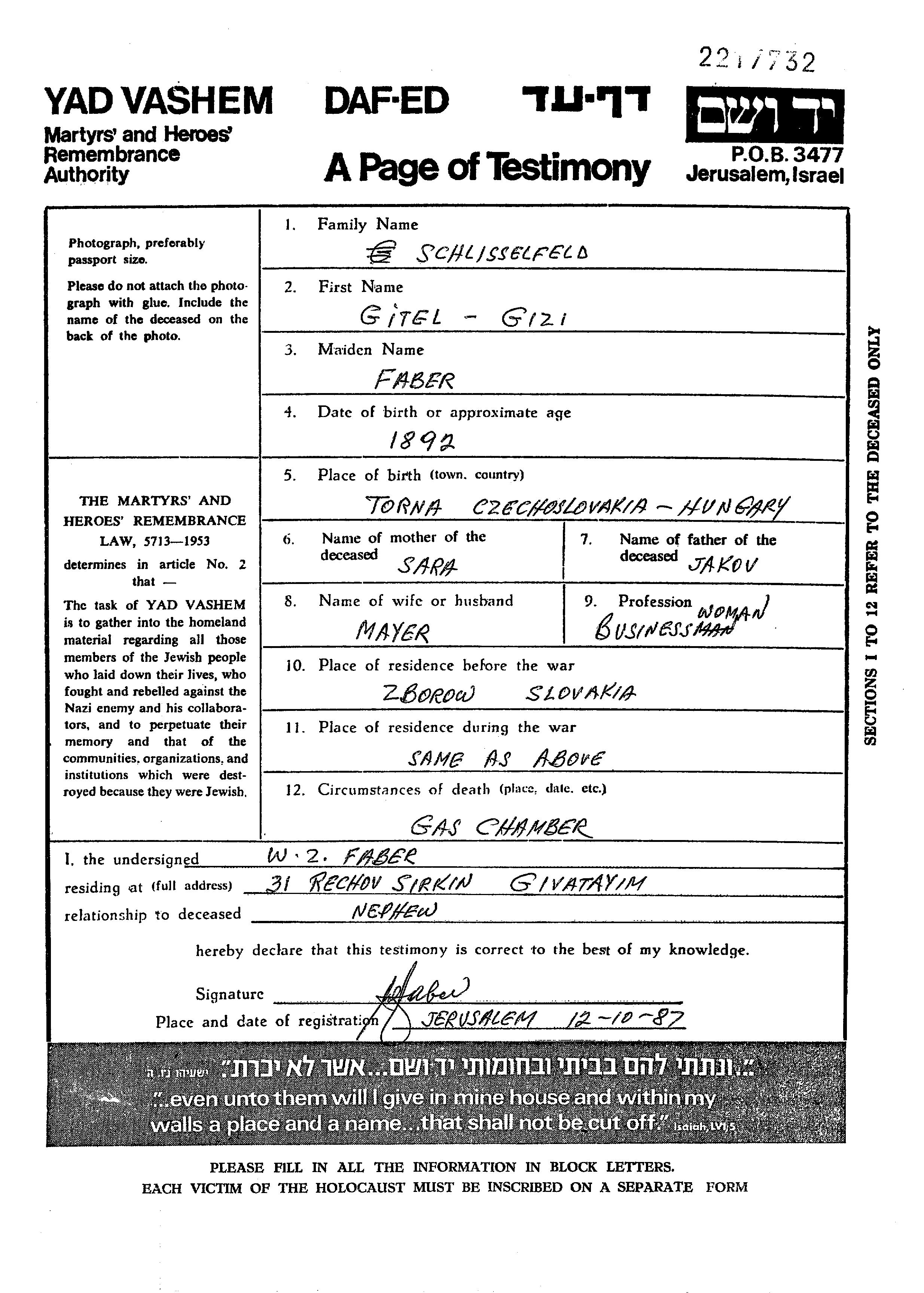 Gizi Gitel Schlisselfeld née Faber est née à Torna, Tchécoslovaquie, fille de Jakov et de Sara. Elle était Homme d'affaire et Mariée à Mayer. Avant la seconde guerre mondiale elle vivait à Zborov, Tchécoslovaquie. Pendant la guerre, elle était à Zborov, Tchécoslovaquie.