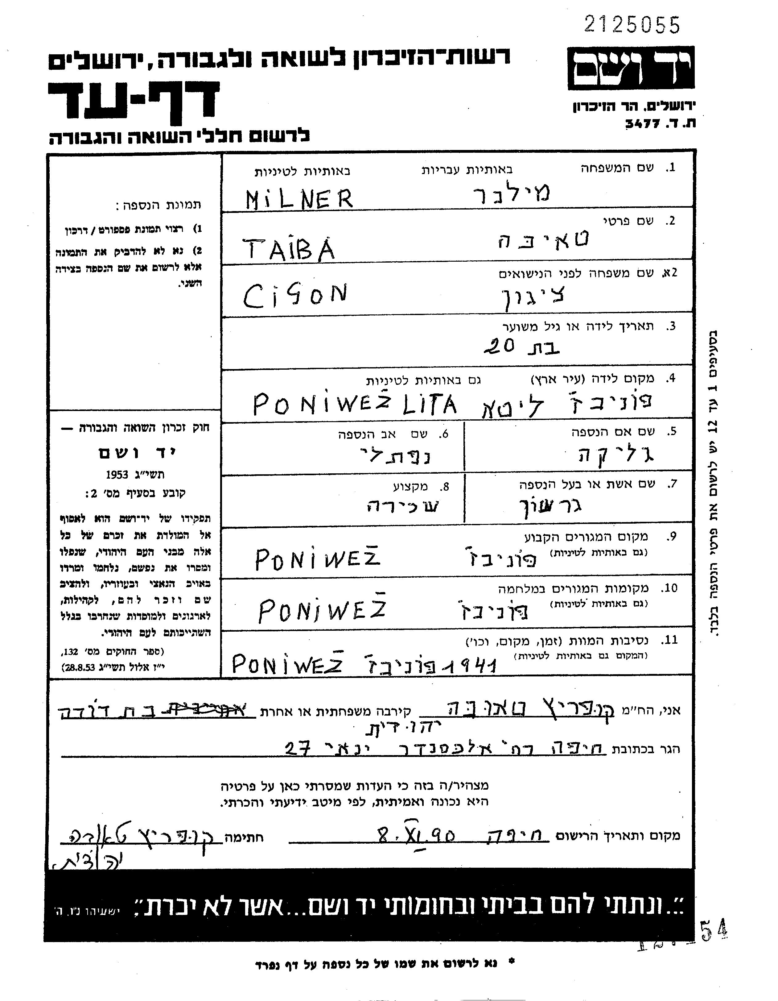 Taiba Milner née Cigon est née à Ponivez, Lituanie en 1921, fille de Naftali et de Glika. Elle était Employé/e de bureau et Mariée à Gershon. Avant la seconde guerre mondiale elle vivait à Ponivez, Lituanie. Pendant la guerre, elle était à Ponivez, Lituanie.