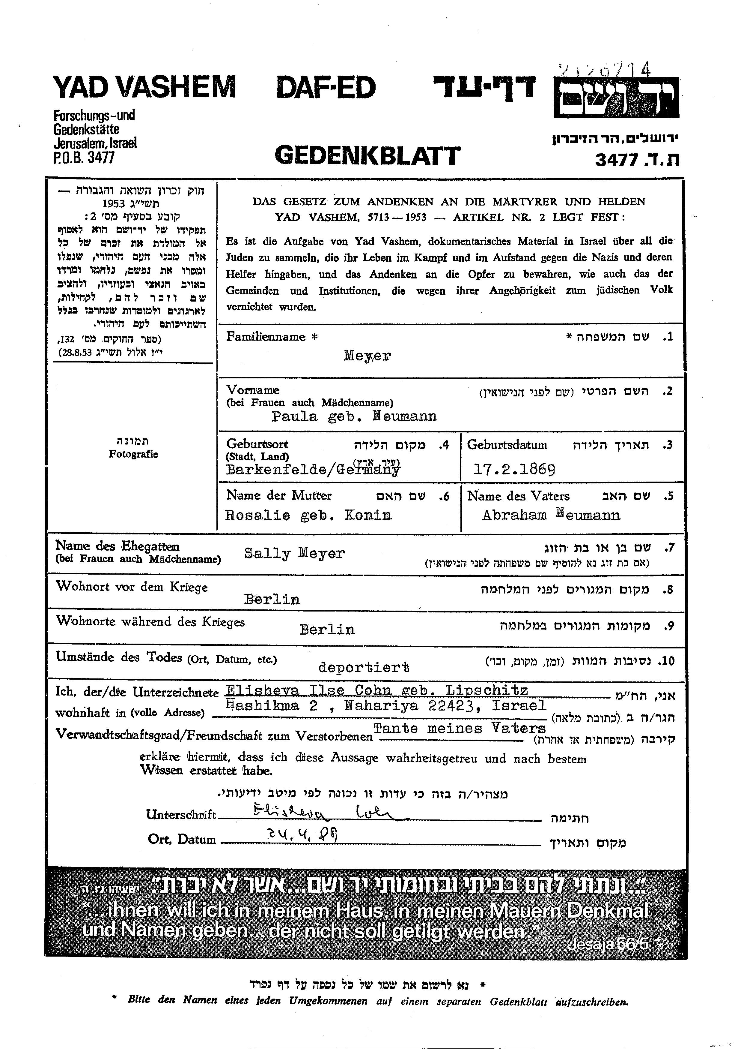 Paula Meyer née Neumann est née à Barkenfelde, Allemagne en 1869, fille de Abraham et de Rosalie née Konin. Elle était Mariée à Sally. Avant la seconde guerre mondiale elle vivait à Berlin, Allemagne. Pendant la guerre, elle était à Berlin, Allemagne.