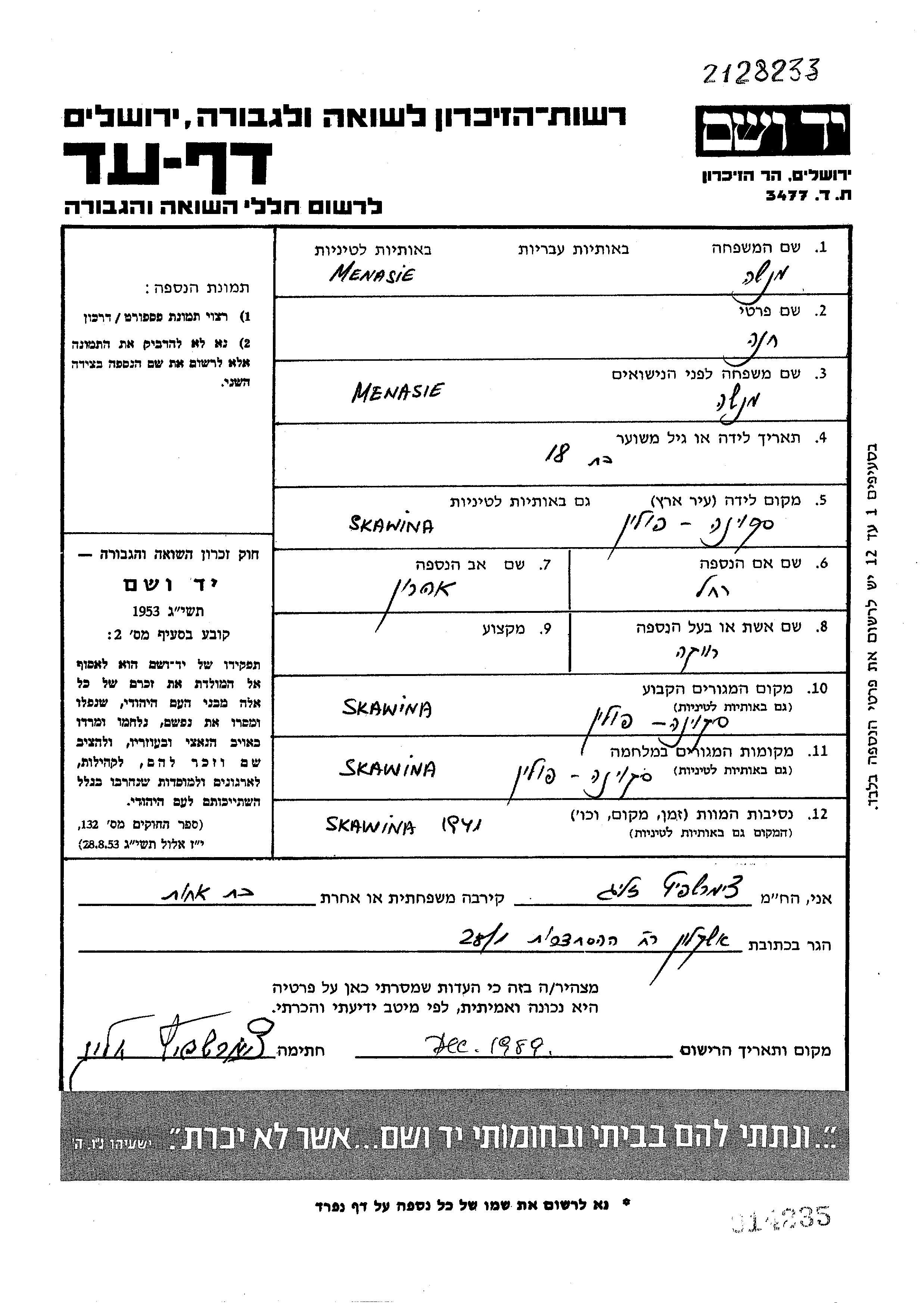 Menasie Khana 1923 Skawina, Pologne Feuille de témoignage