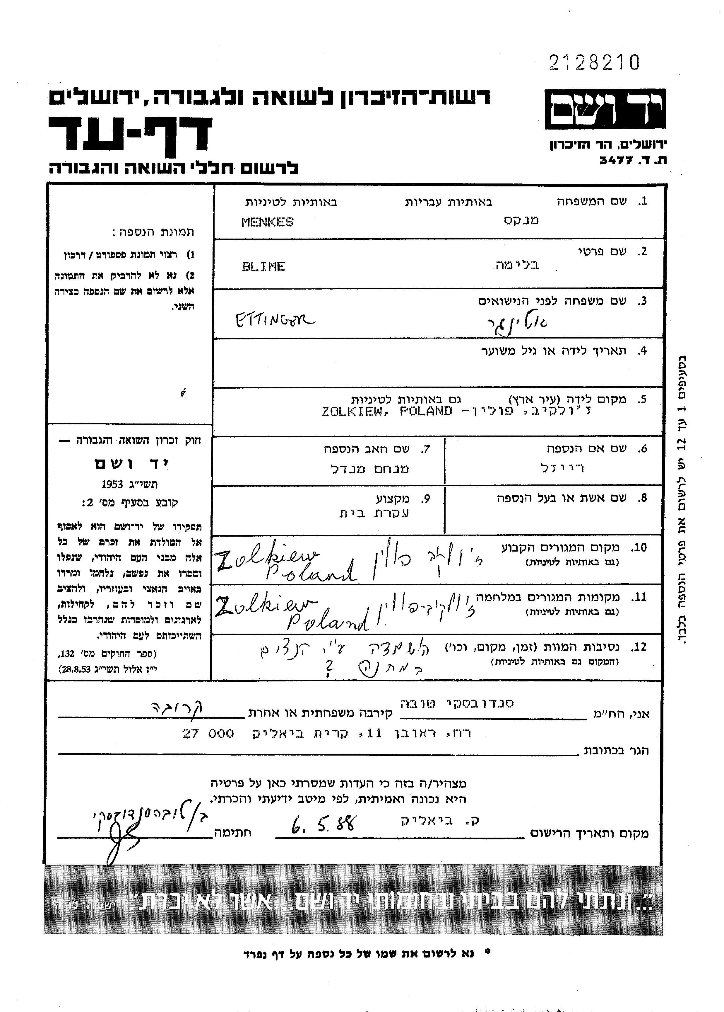 Menkes Blime Zolkiew, Pologne Feuille de témoignage