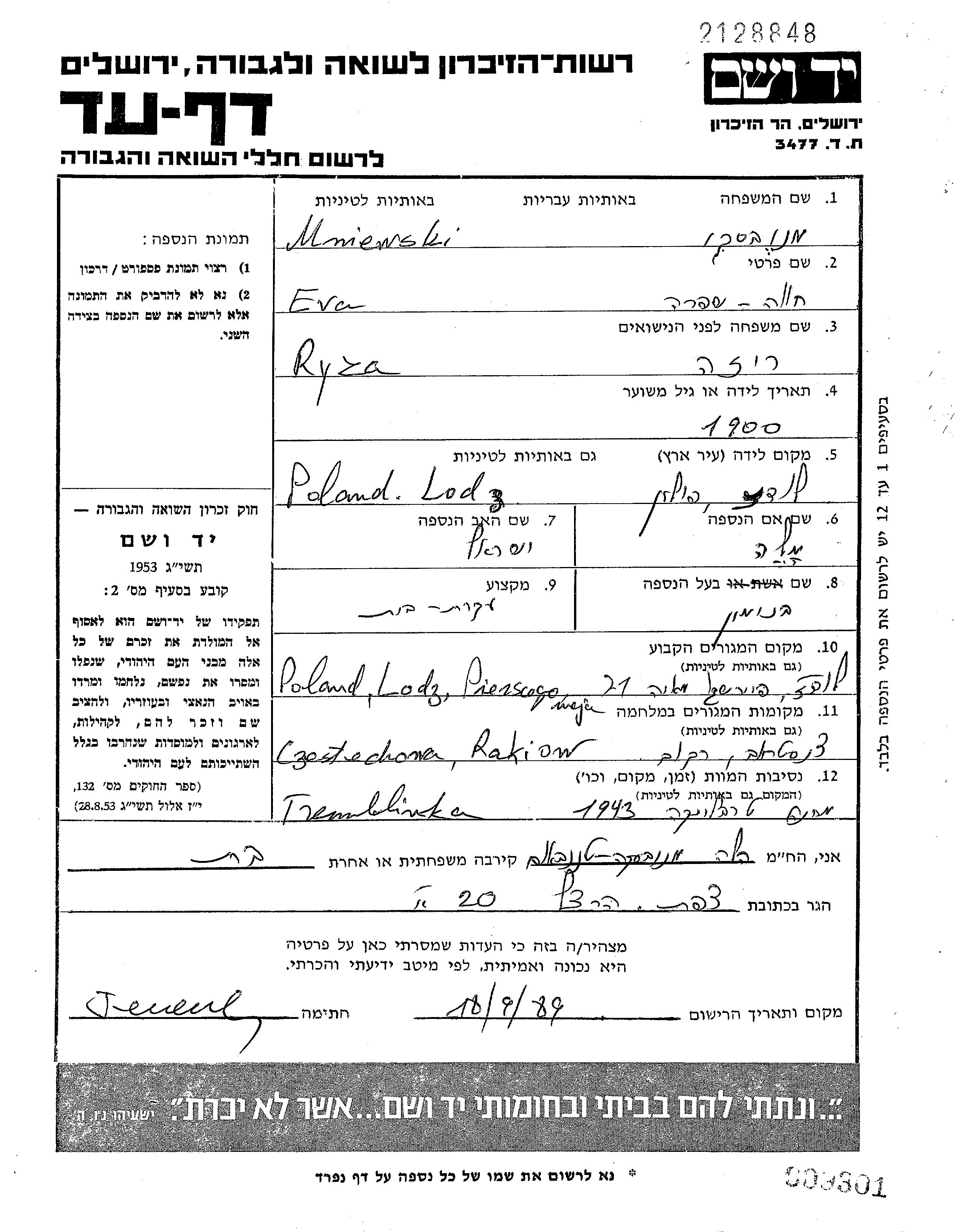 Mniewski Menivski Khava Shifra Eva 1900 Lodz, Pologne Feuille de témoignage
