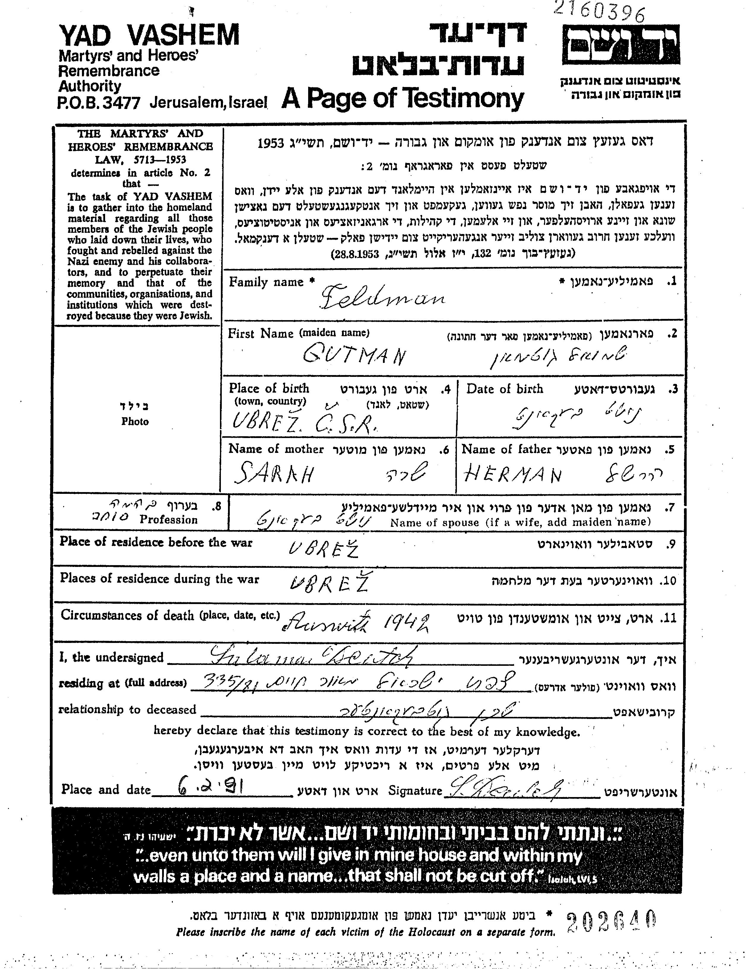 Feldman Shmuel Gutman Ubrez, Tchécoslovaquie Feuille de témoignage