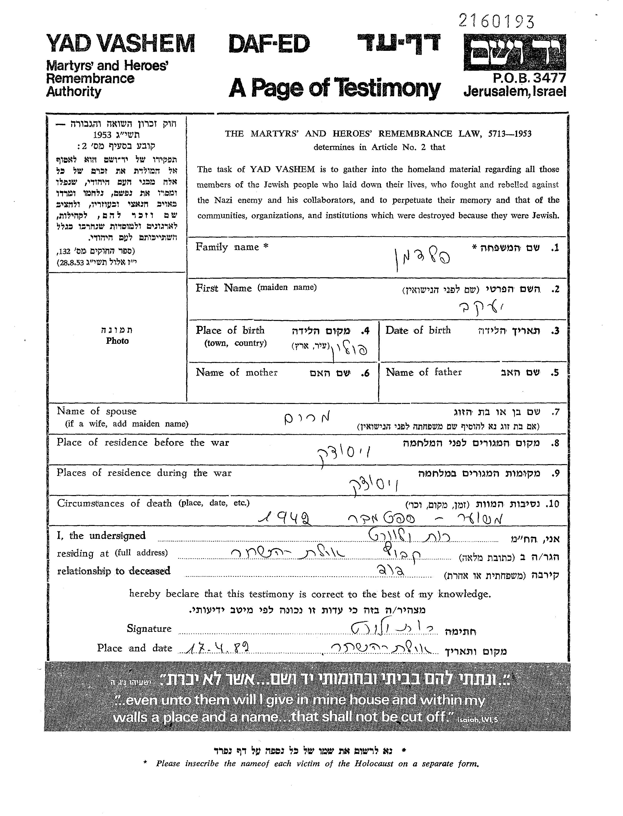 Yad Vashem - Pages of Testimony Names Memorial Collection