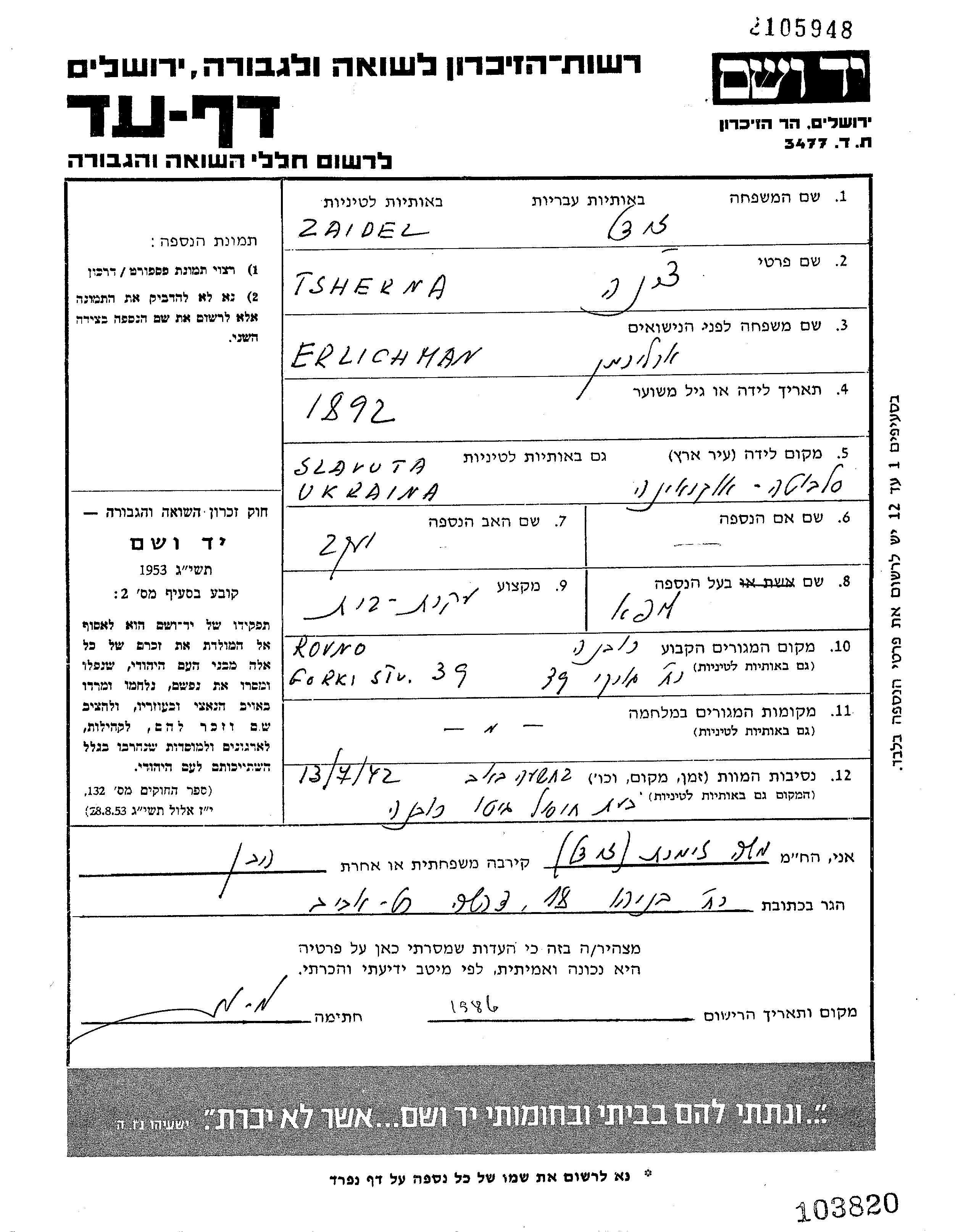 Tsherna Zeidel née Erlichman est née à Slavuta, Ukraine (URSS), fille de Yaakov. Elle était Femme au foyer et Mariée à Lipa. Avant la seconde guerre mondiale elle vivait à Rowne, Pologne. Pendant la guerre, elle était à Rowne, Pologne.