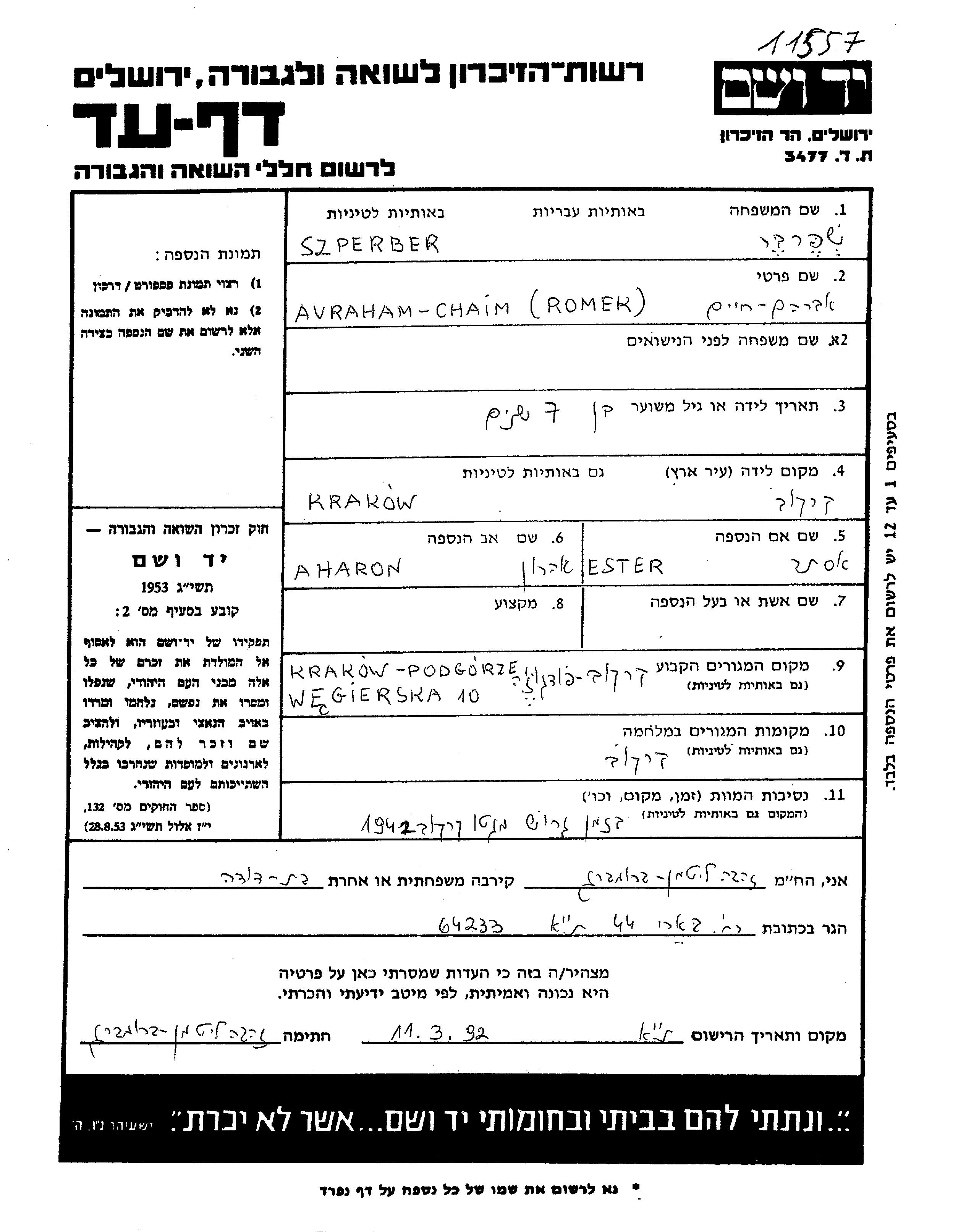 Szperber Chaim Romek Avraham Krakow, Pologne Feuille de témoignage