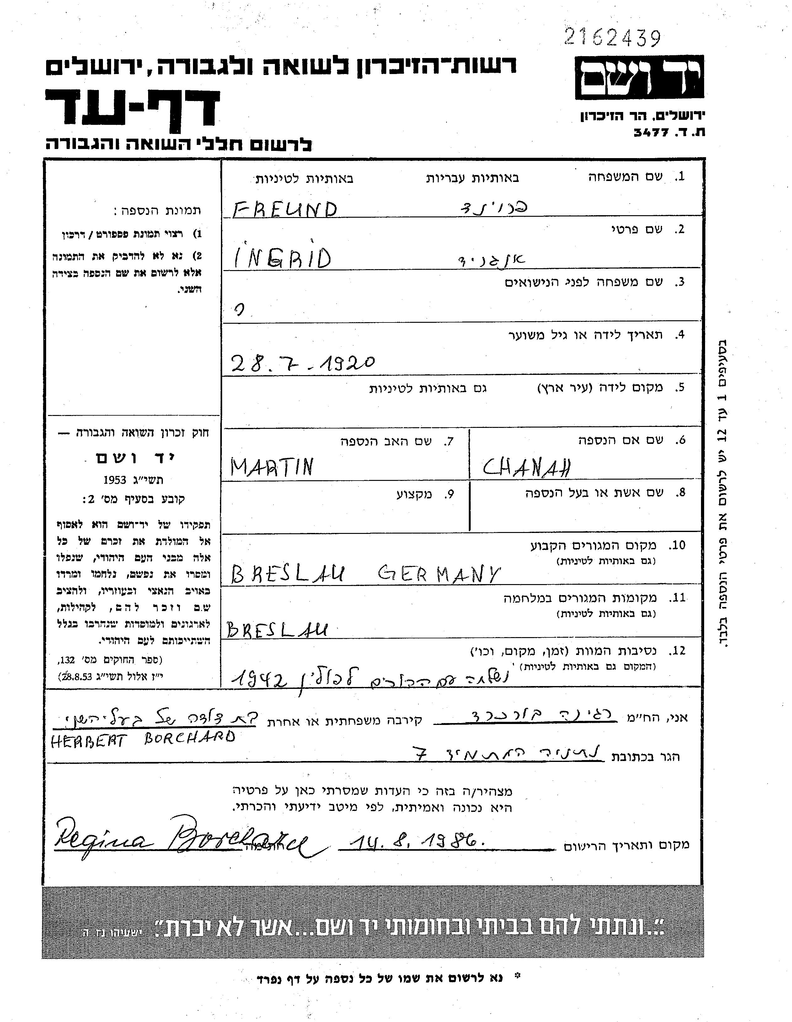 Ingrid Freund est née en 1920, fille de Martin Perez et de Chanah née Burkhard. Avant la seconde guerre mondiale elle vivait à Breslau, Allemagne. Pendant la guerre, elle était à Pologne.