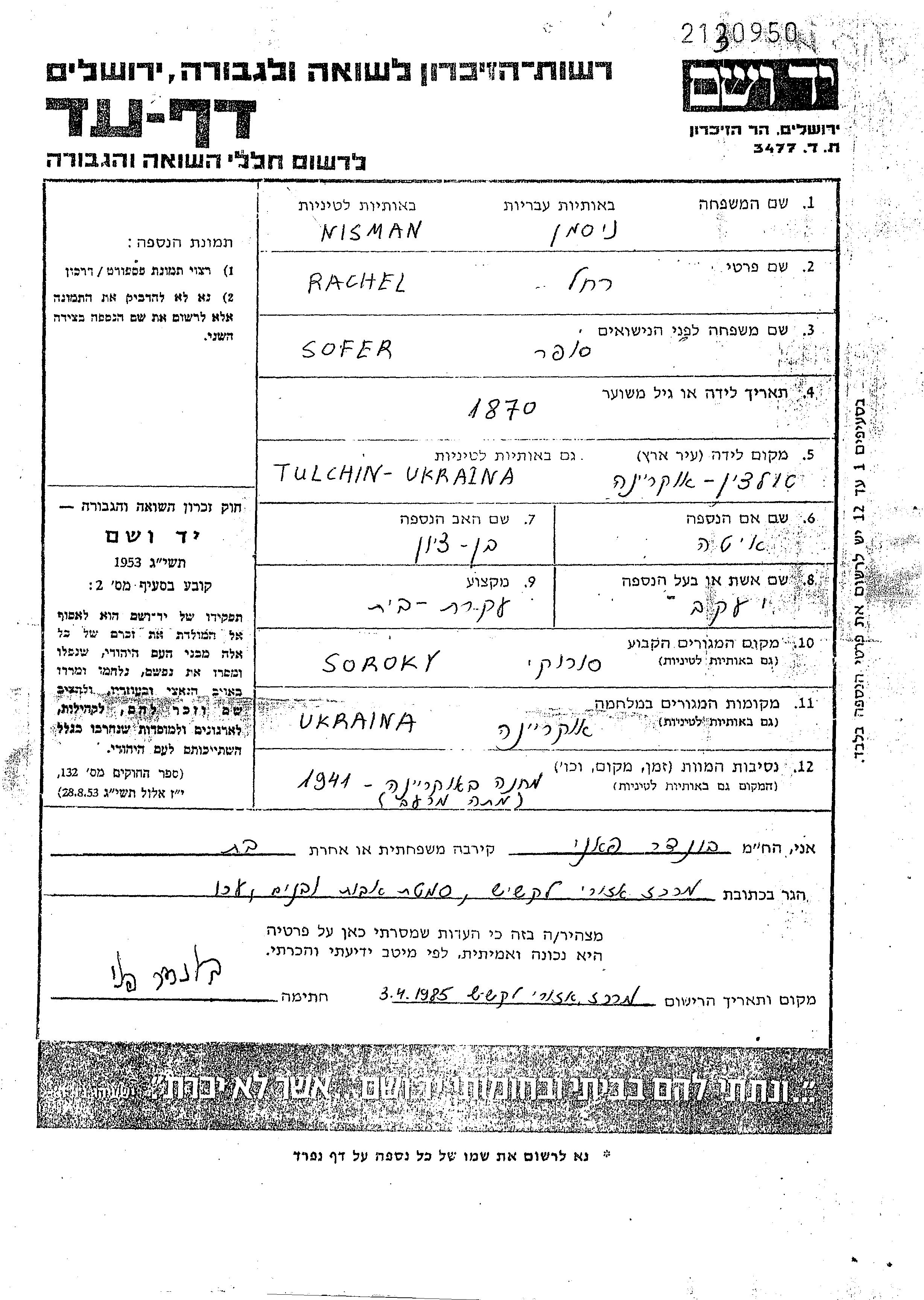 Rachel Nisman née Sofer est née à Tulchin, Ukraine (URSS) en 1870, fille de Bentzion et de Ita. Elle était Femme au foyer et Mariée à Jecob. Avant la seconde guerre mondiale elle vivait à Soroca, Roumanie. Pendant la guerre, elle était à Ukraine (URSS).