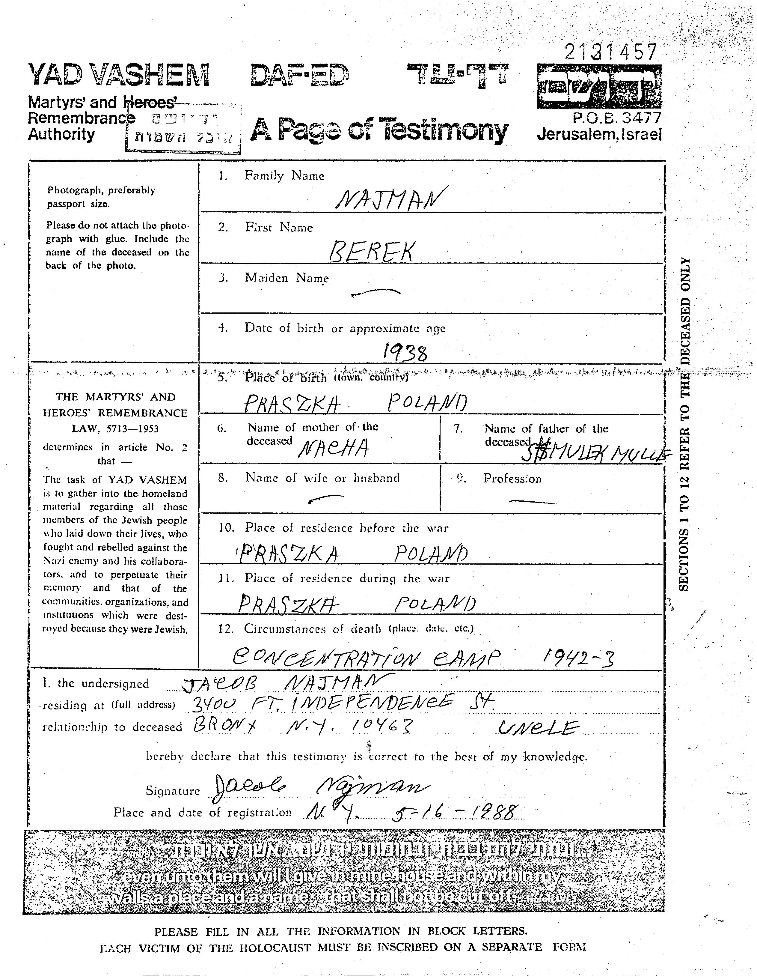 Berek Najman est né à Praszka, Pologne en 1938, fils de Shmulek et de Nacha née Goldberg. Il était Enfant. Avant la seconde guerre mondiale il vivait à Praszka, Pologne. Au cours de la guerre, il était à Praszka, Pologne.