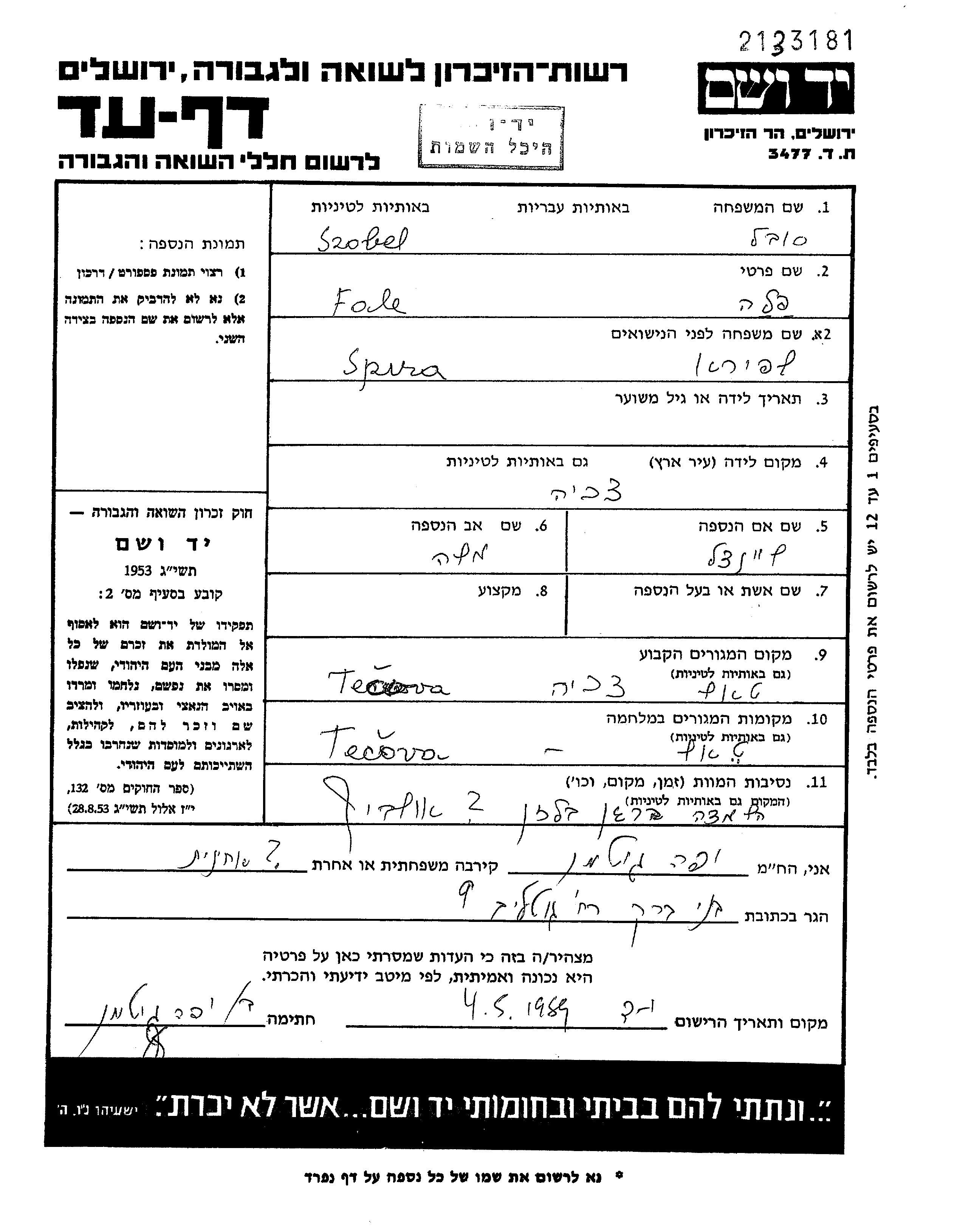 Fale Szobel née Spira est née à Tchécoslovaquie, fille de Moshe et de Sheindl. Elle était Mariée à Mendel. Avant la seconde guerre mondiale elle vivait à Tecova, Tchécoslovaquie. Pendant la guerre, elle était à Tecova, Tchécoslovaquie.