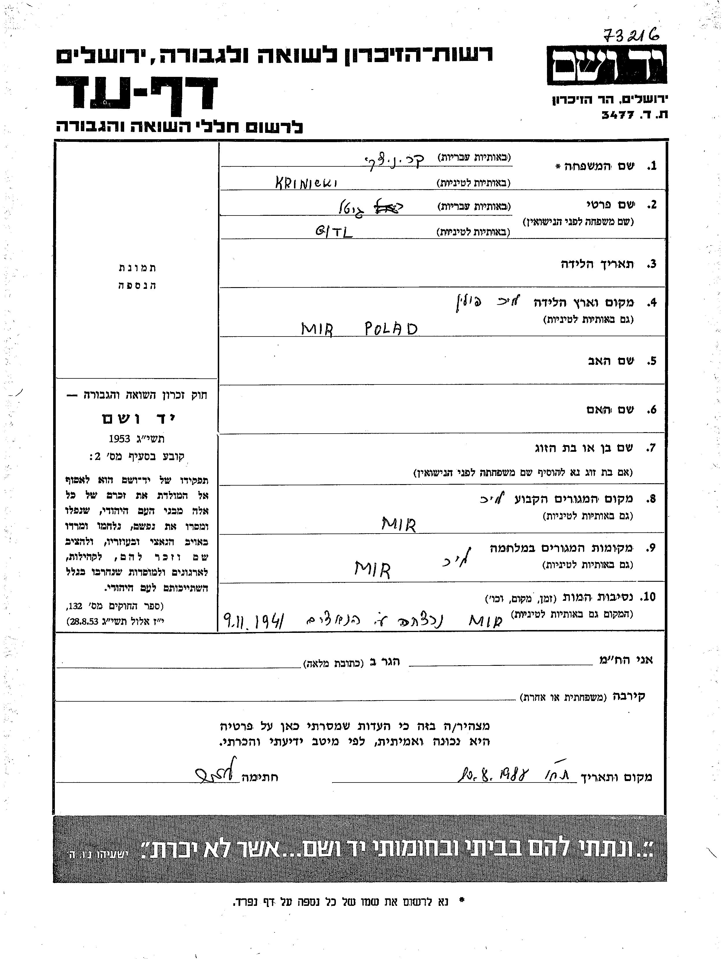 Krinicki Gitl Mir, Pologne Feuille de témoignage