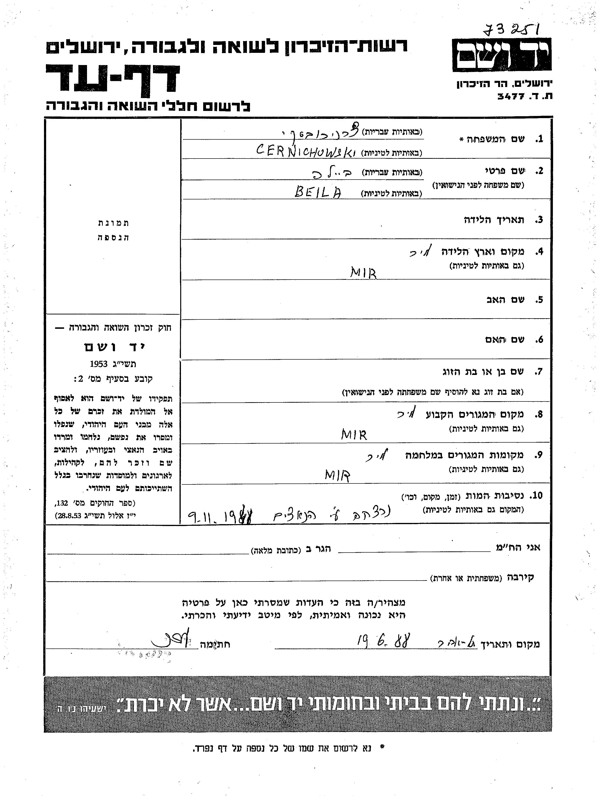 Cernichowski Beila Mir, Pologne Feuille de témoignage