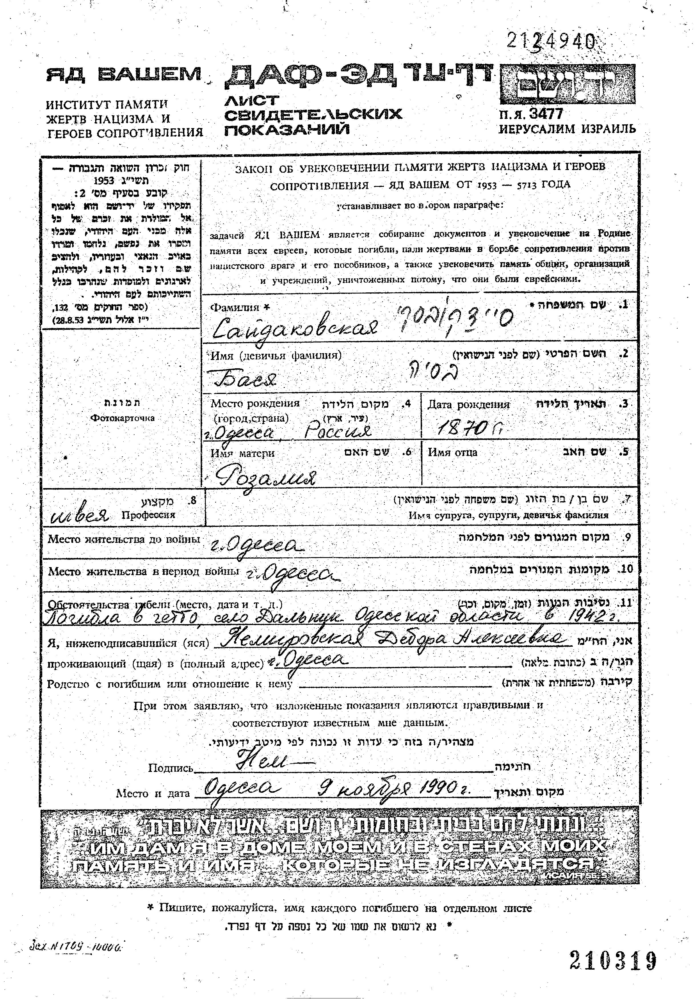 Saidakovski Basya Odessa, Ukraine (URSS) Feuille de témoignage