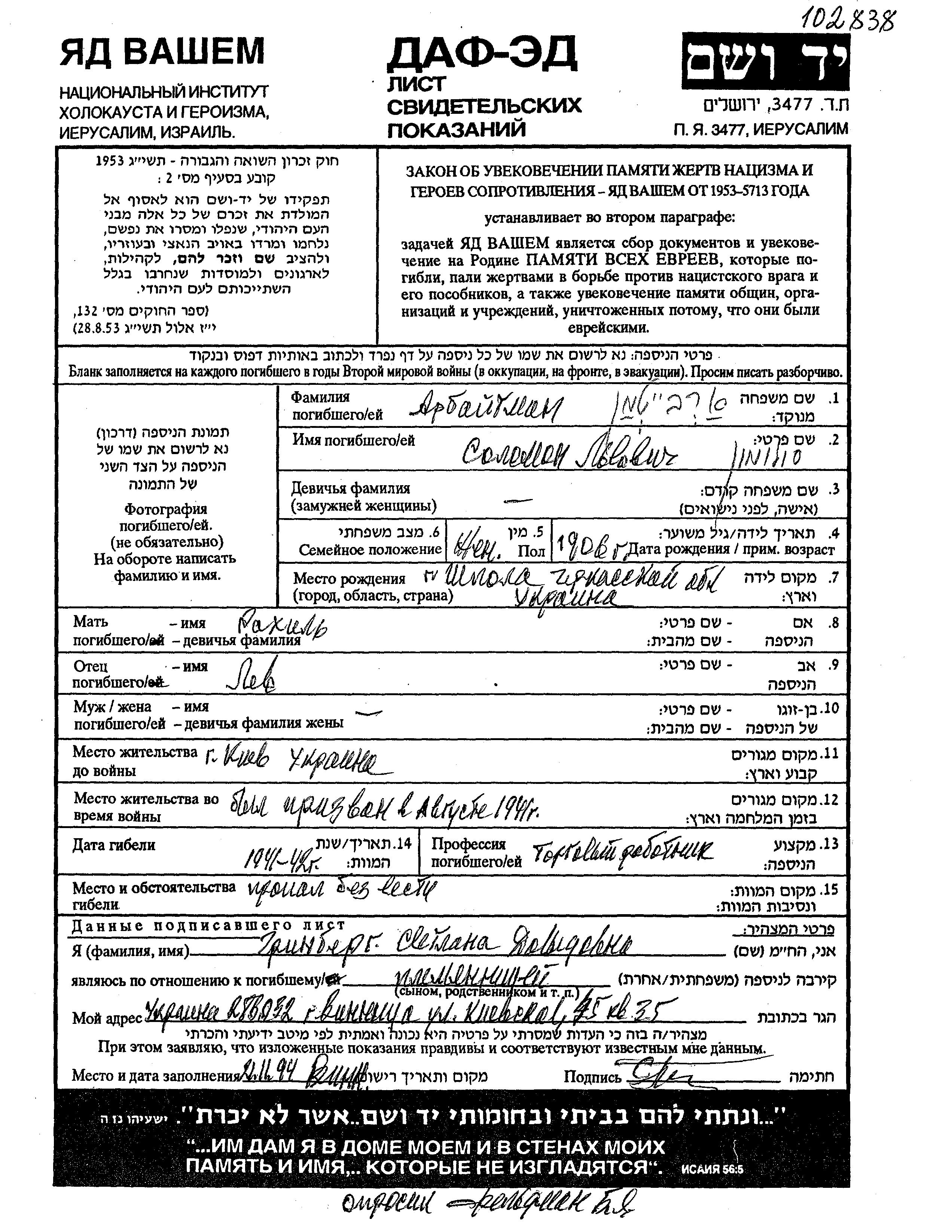 Arbaytman Solomon 1906 Kiyev, Ukraine (URSS) Feuille de témoignage