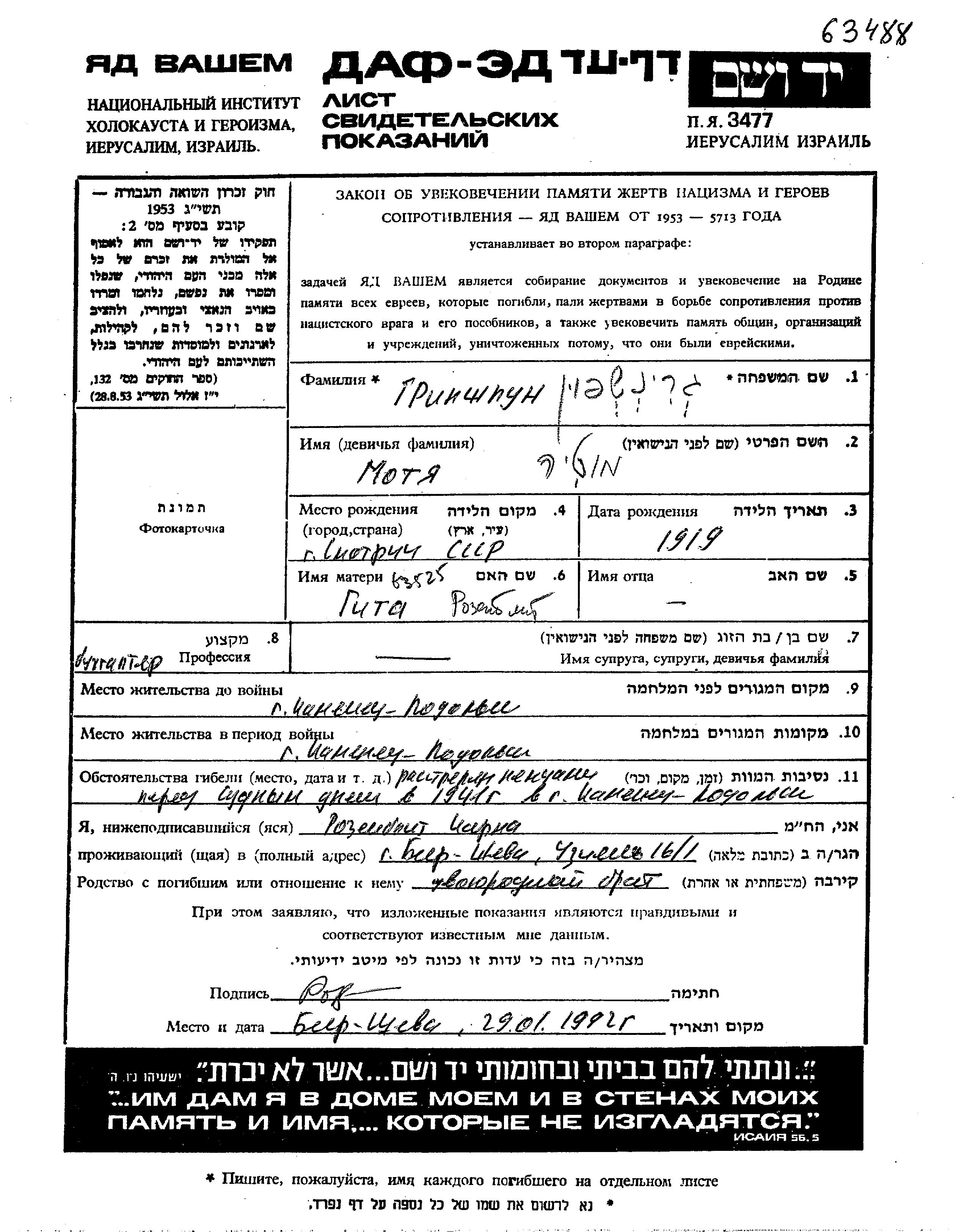 Grinshpun Motia 1919 Kamenets Podolskiy, Ukraine (URSS) Feuille de témoignage