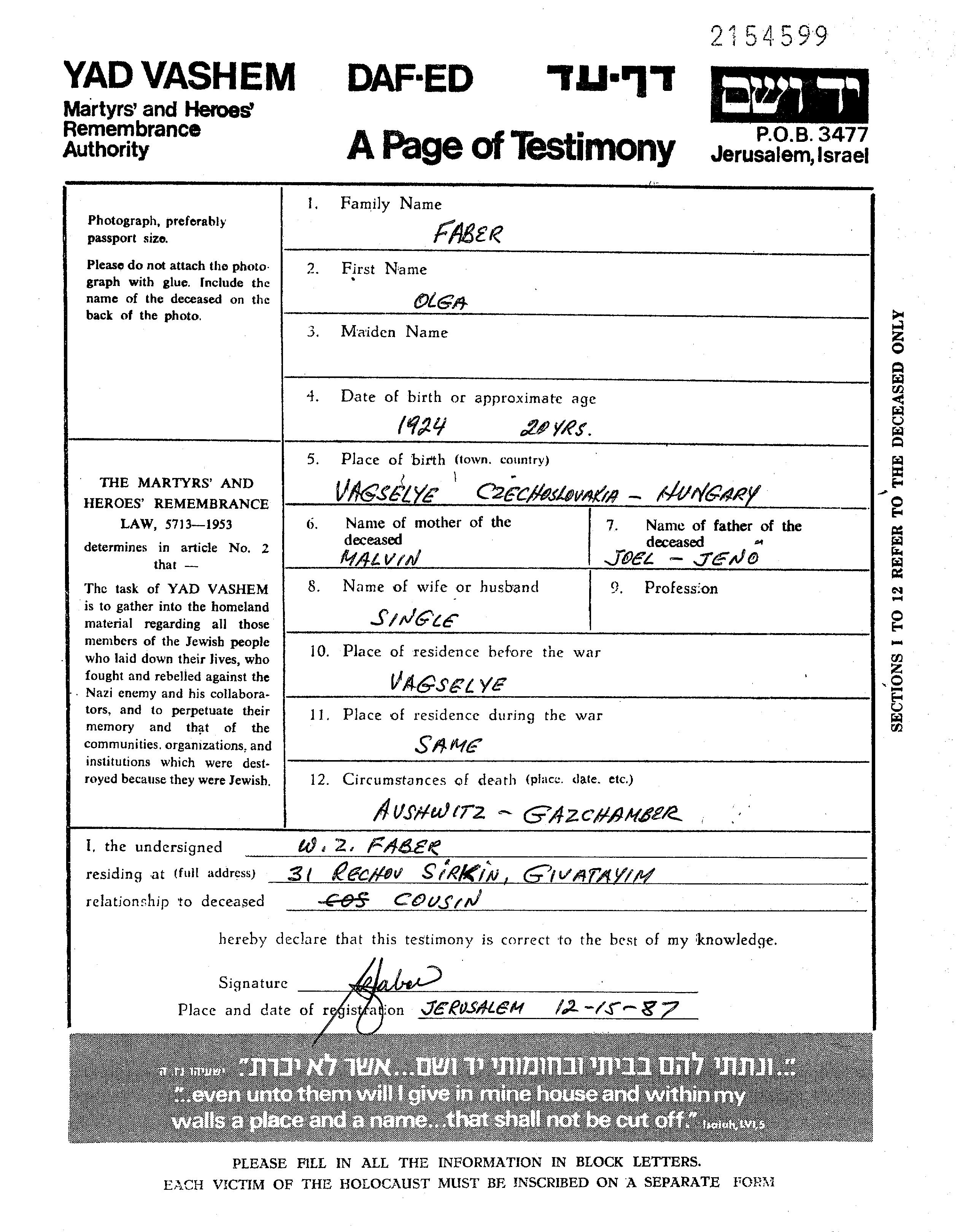 Olga Faber est née à Vagsellye, Tchécoslovaquie en 1924, fille de Jeno Joel et de Malvina Malvin née Reichenthal. Elle était Célibataire. Avant la seconde guerre mondiale elle vivait à Vagsellye, Tchécoslovaquie. Pendant la guerre, elle était à Vagsellye, Tchécoslovaquie.