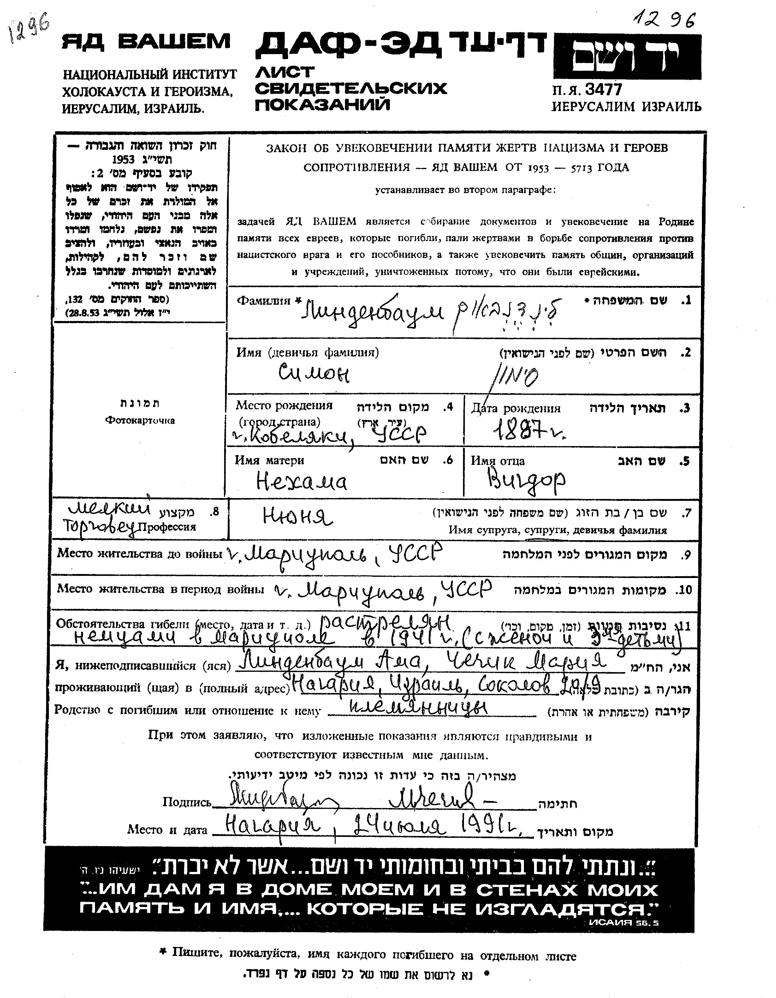 Lindenbaum Simon 1887 Mariupol, Ukraine (URSS) Feuille de témoignage