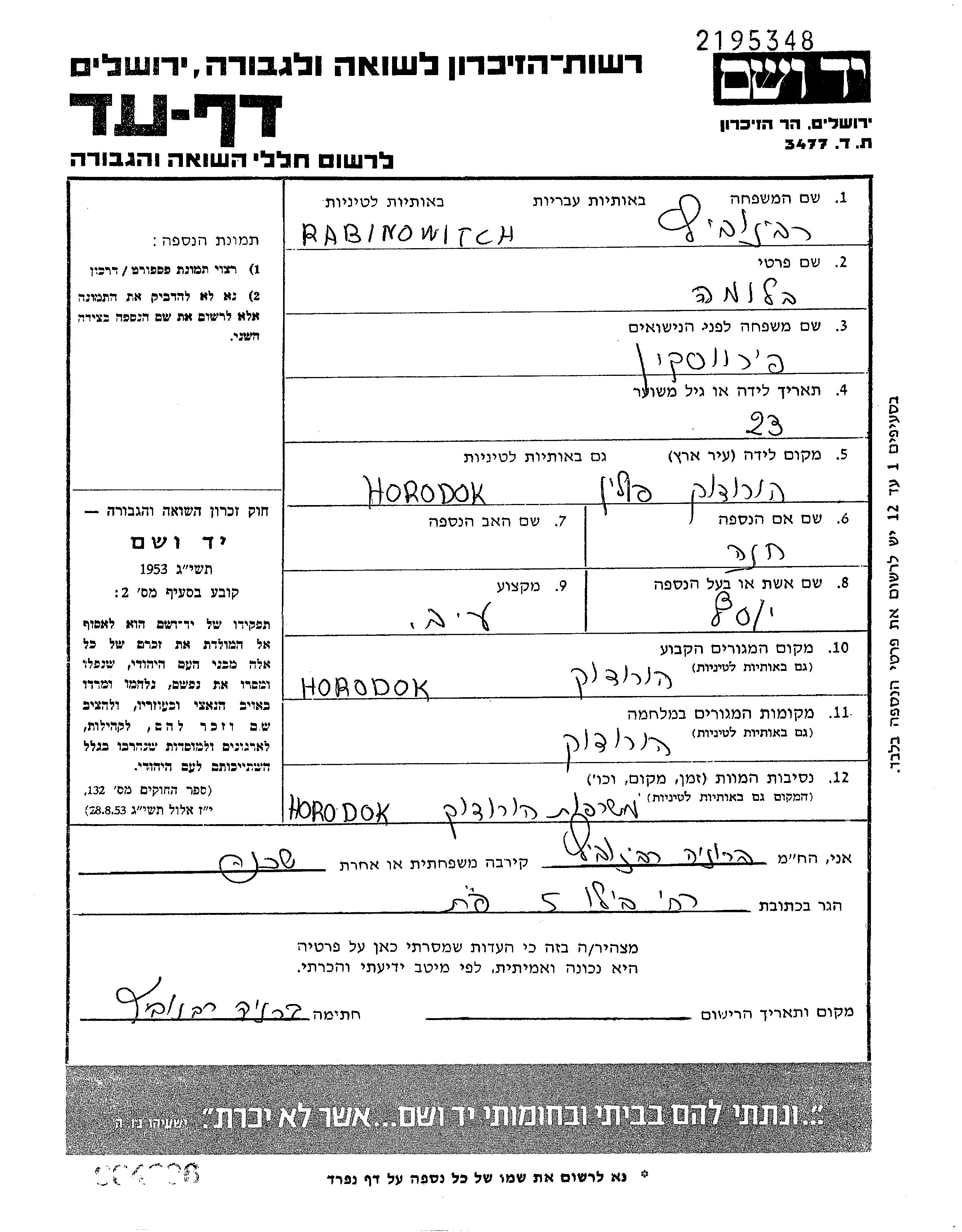 Rabinowitch Bluma Horodek, Pologne Feuille de témoignage