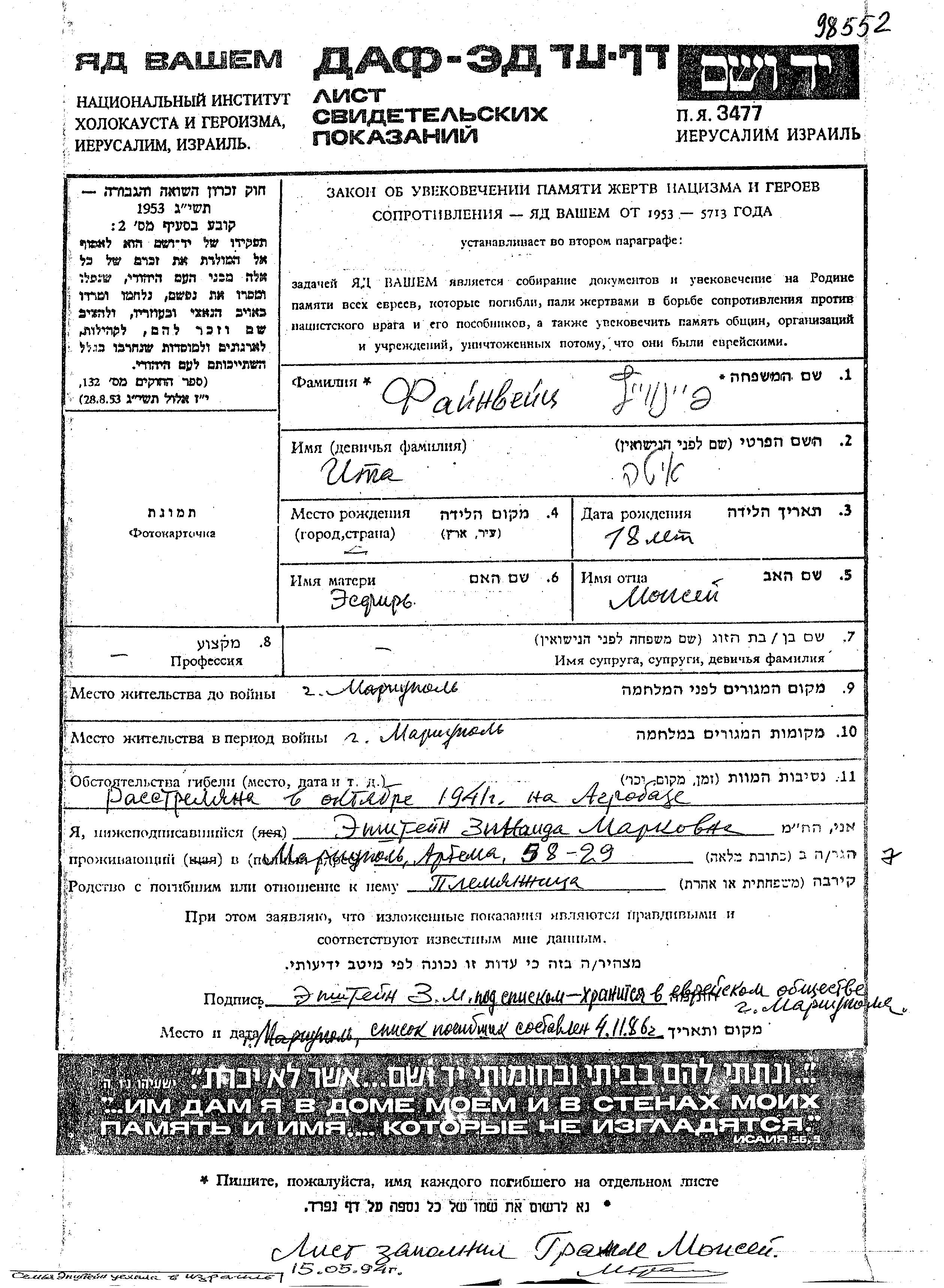 Faynveytz Ita 1923 Mariupol, Ukraine (URSS) Feuille de témoignage