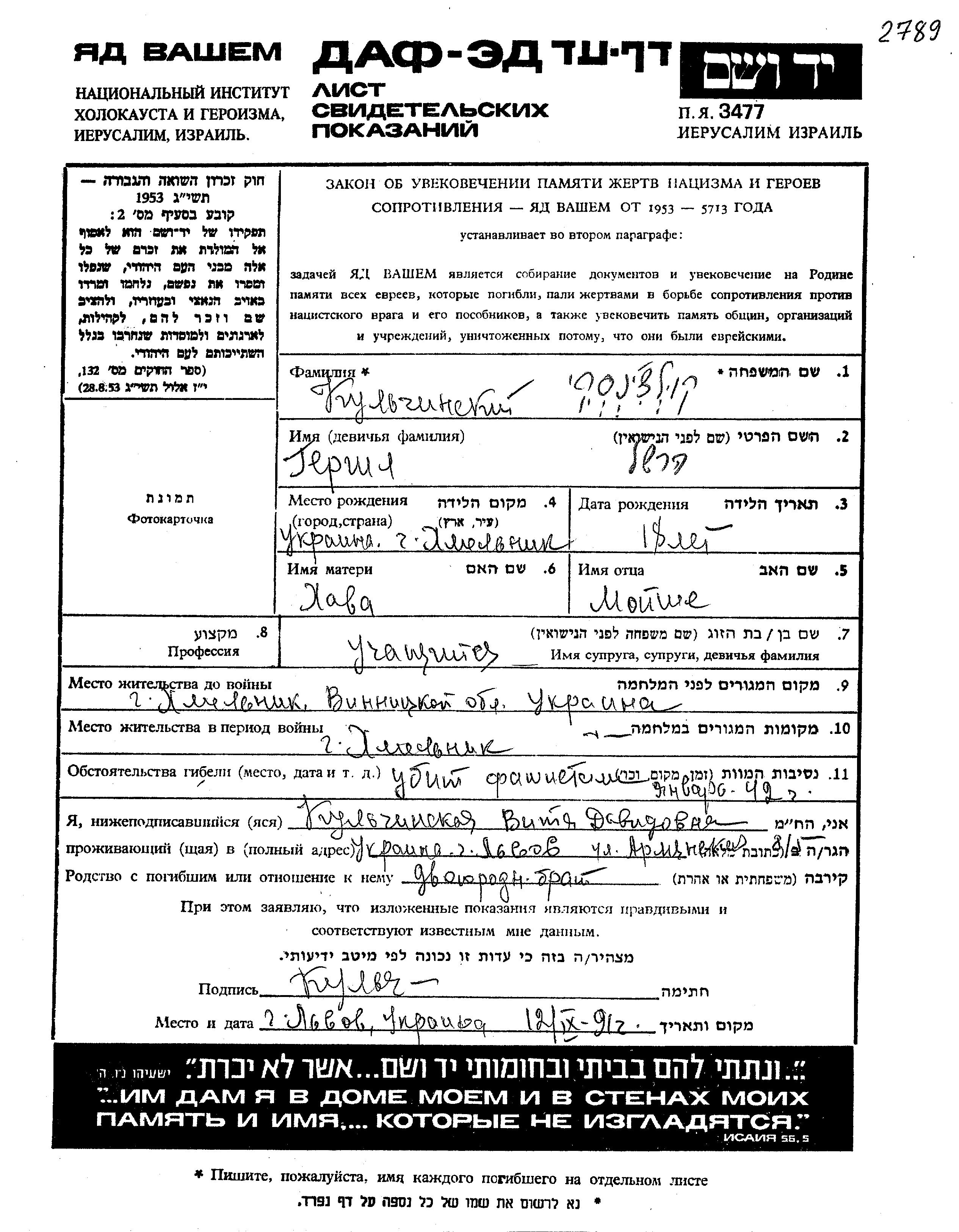 Kulchinski Hershl 1924 Khmelnik, Ukraine (URSS) Feuille de témoignage