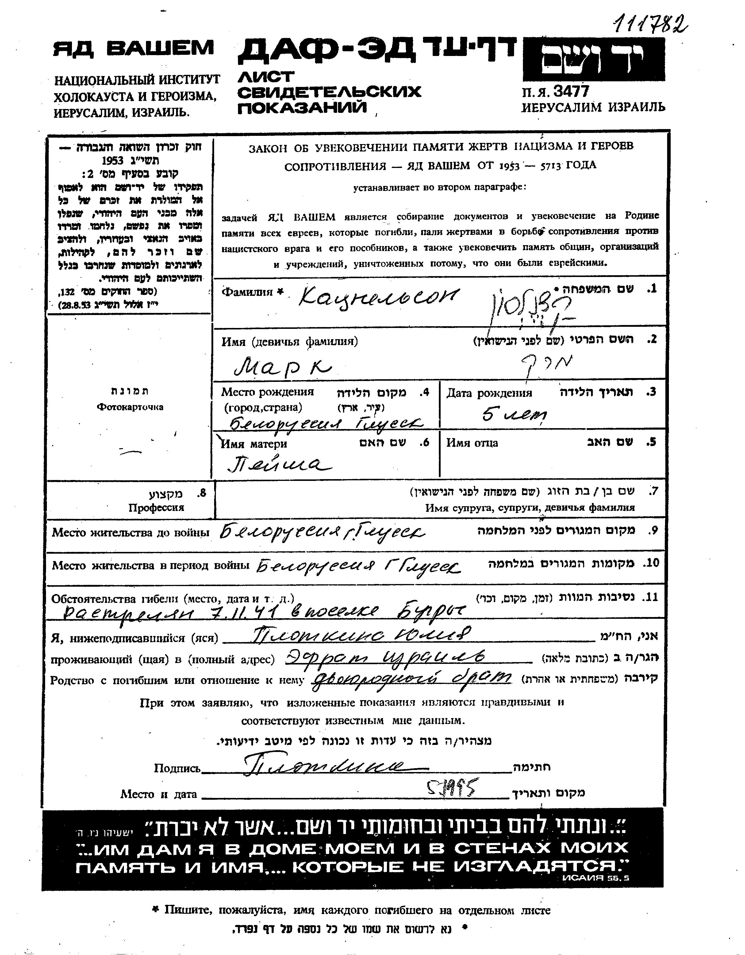 Katznelson Mark 1936 Glussk, Bélorussie (URSS) Feuille de témoignage