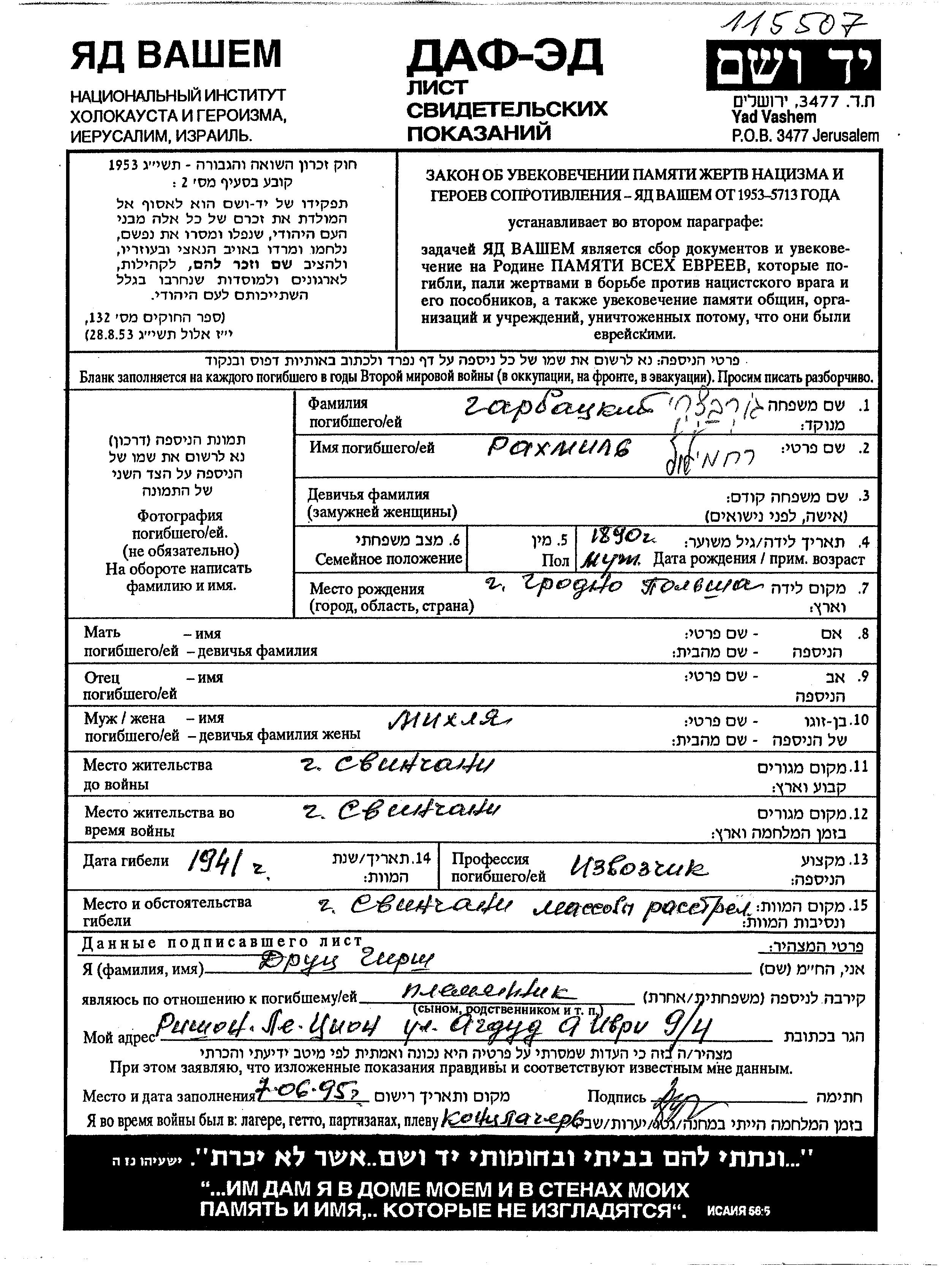 Gorbatzki Rakhmil 1890 Swieciany, Pologne Feuille de témoignage