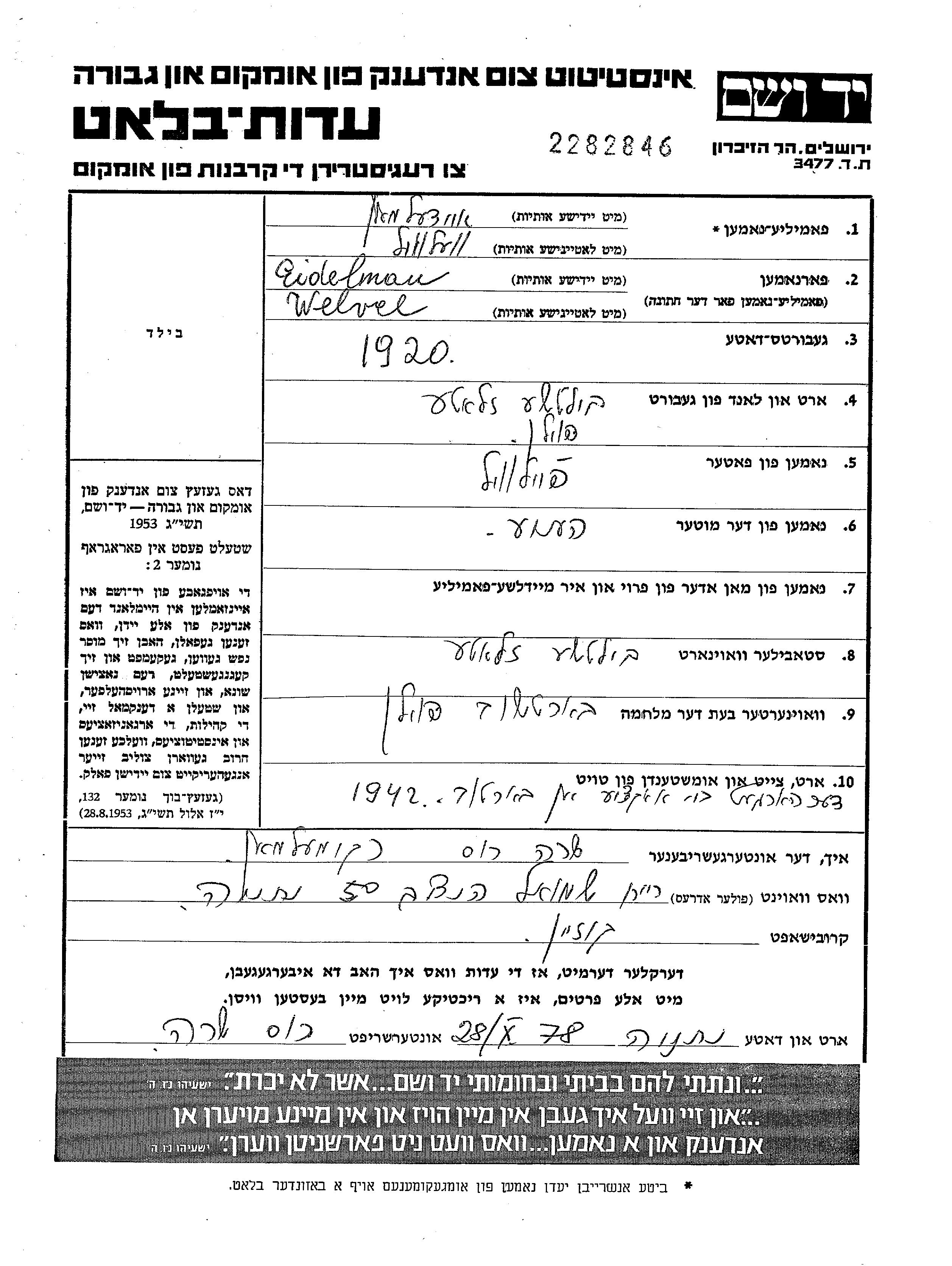 Welvel Eidelman est né à Bilcze Zlote, Pologne en 1920, fils de Feiwl et de Henie Henia. Il était Célibataire. Avant la seconde guerre mondiale il vivait à Bilcze Zlote, Pologne. Au cours de la guerre, il était à Borszczow, Pologne.