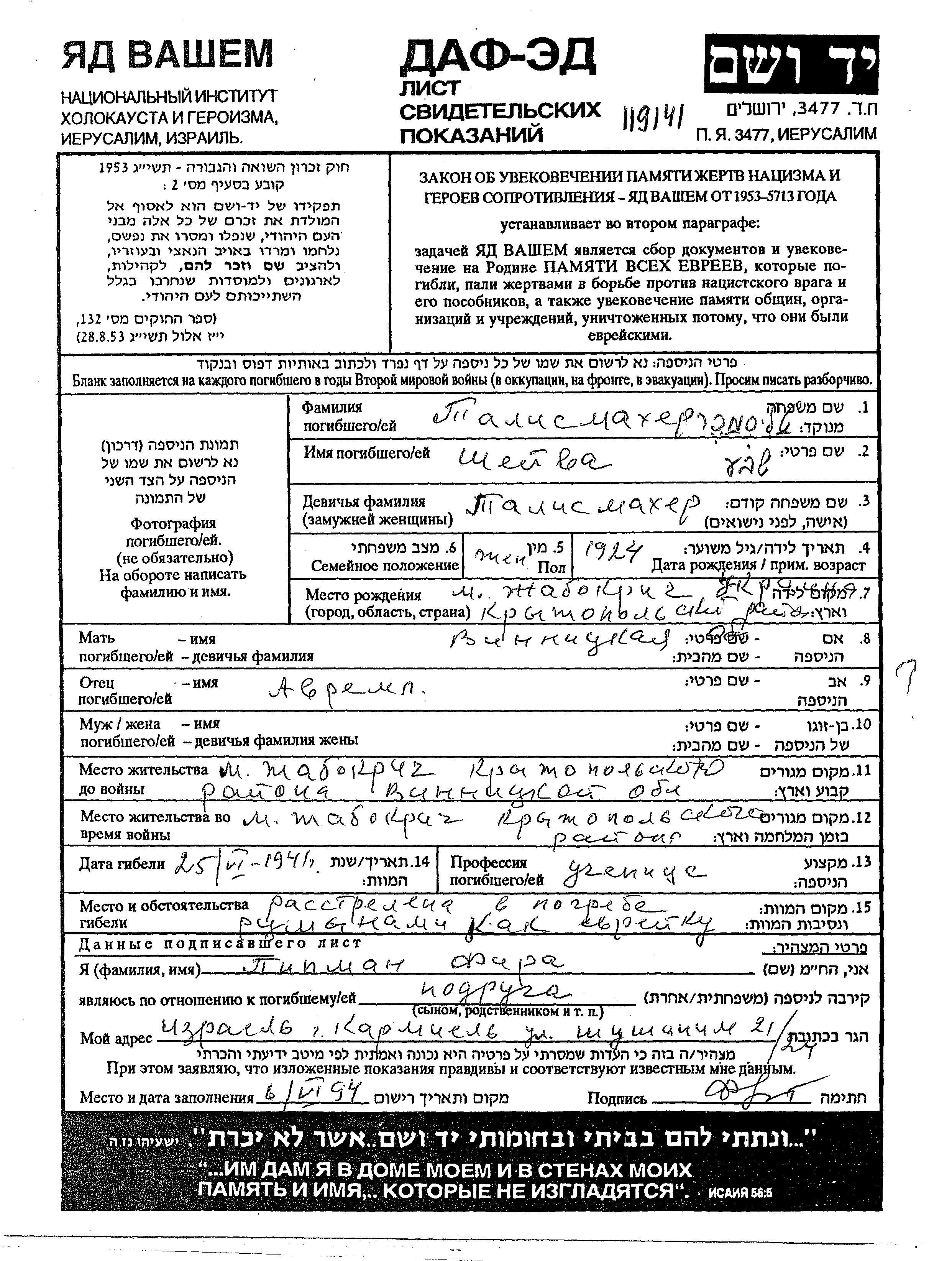 Yad Vashem - Pages of Testimony Names Memorial Collection