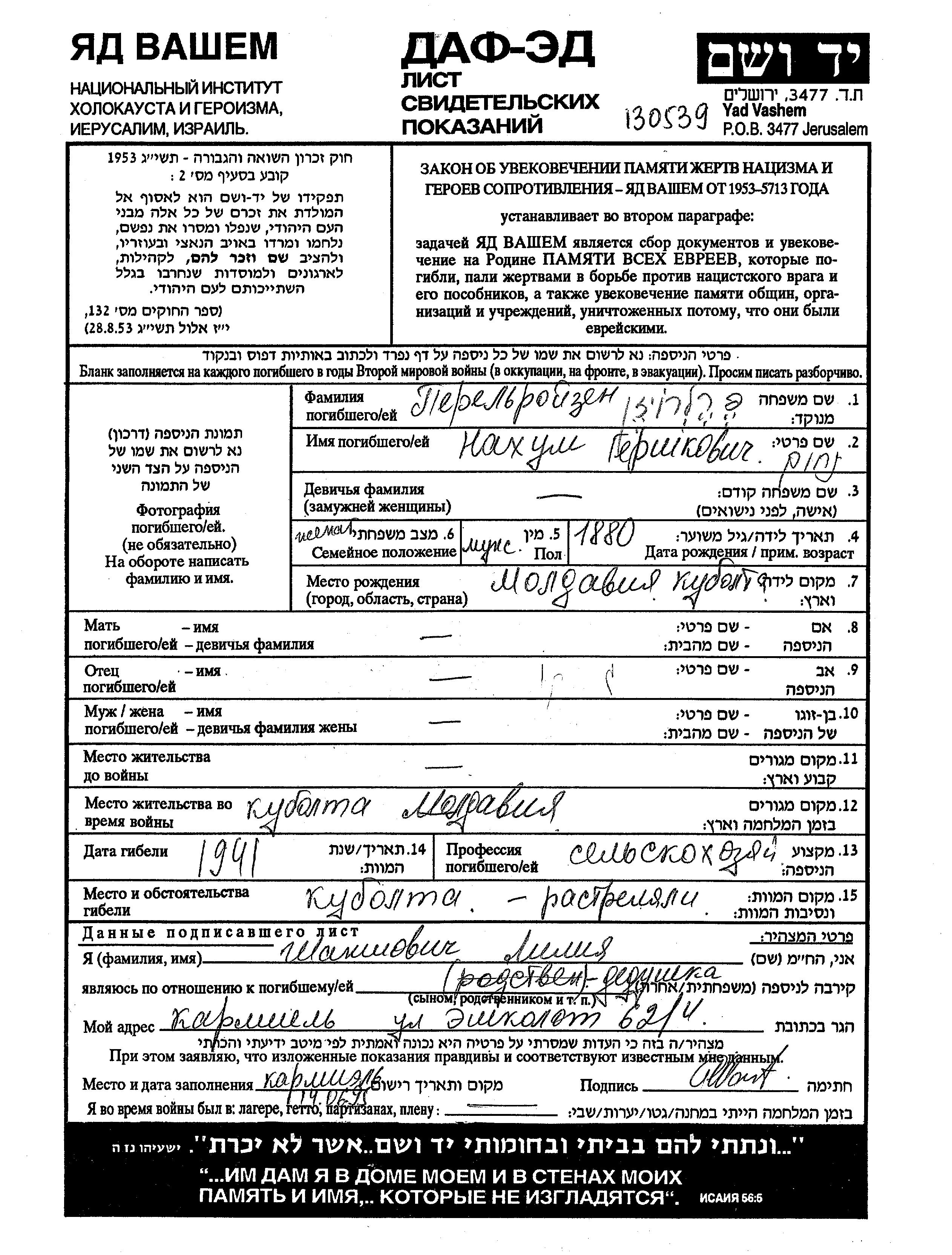 Perelroyzen Nakhum 1880 endroit inconnu, Feuille de témoignage