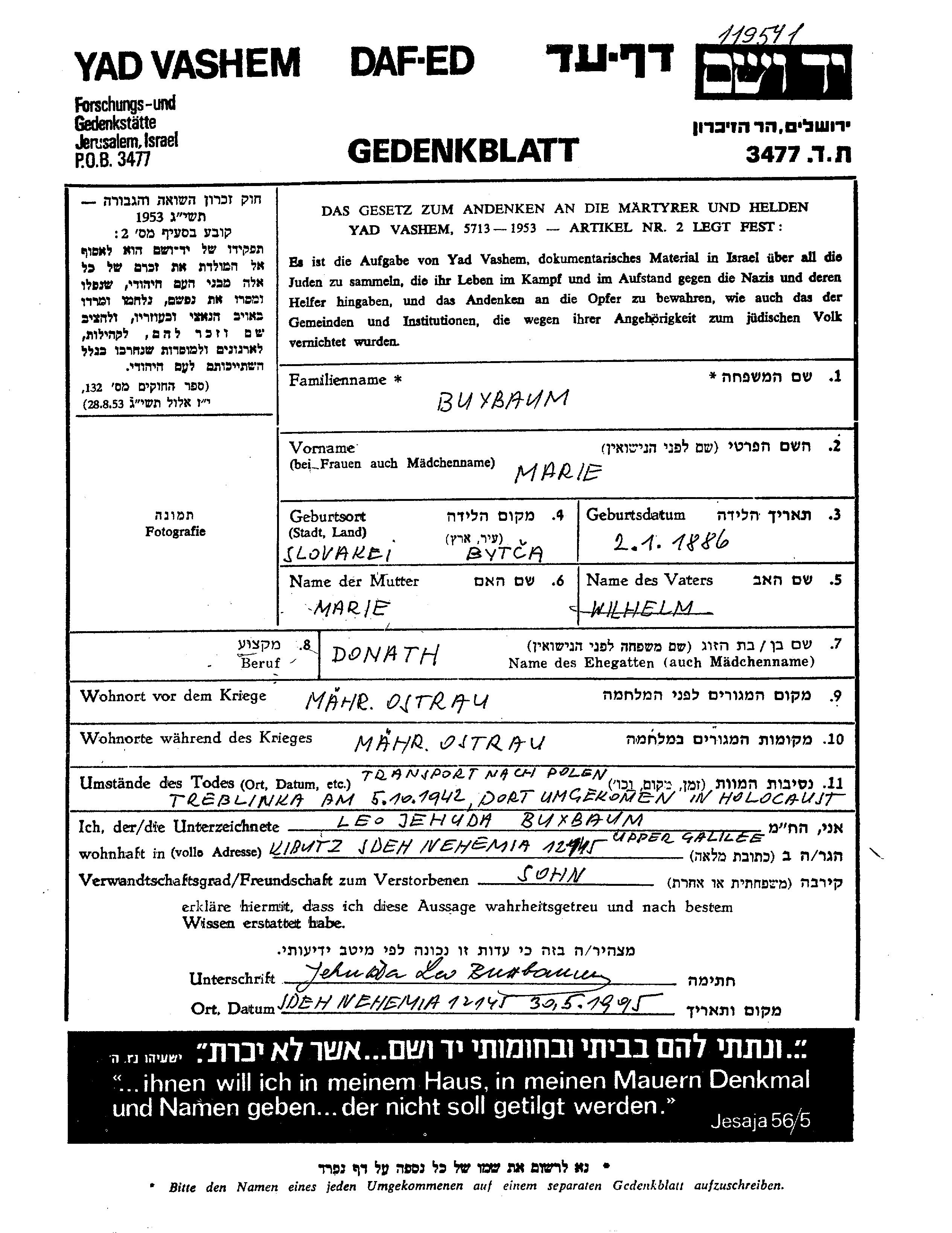 Marie Buxbaum née Donath est née à Bytca, Tchécoslovaquie en 1886. Elle était Mariée à Wilhelm. Avant la seconde guerre mondiale elle vivait à Ostrava, Tchécoslovaquie. Pendant la guerre, elle était à Ostrava, Tchécoslovaquie.