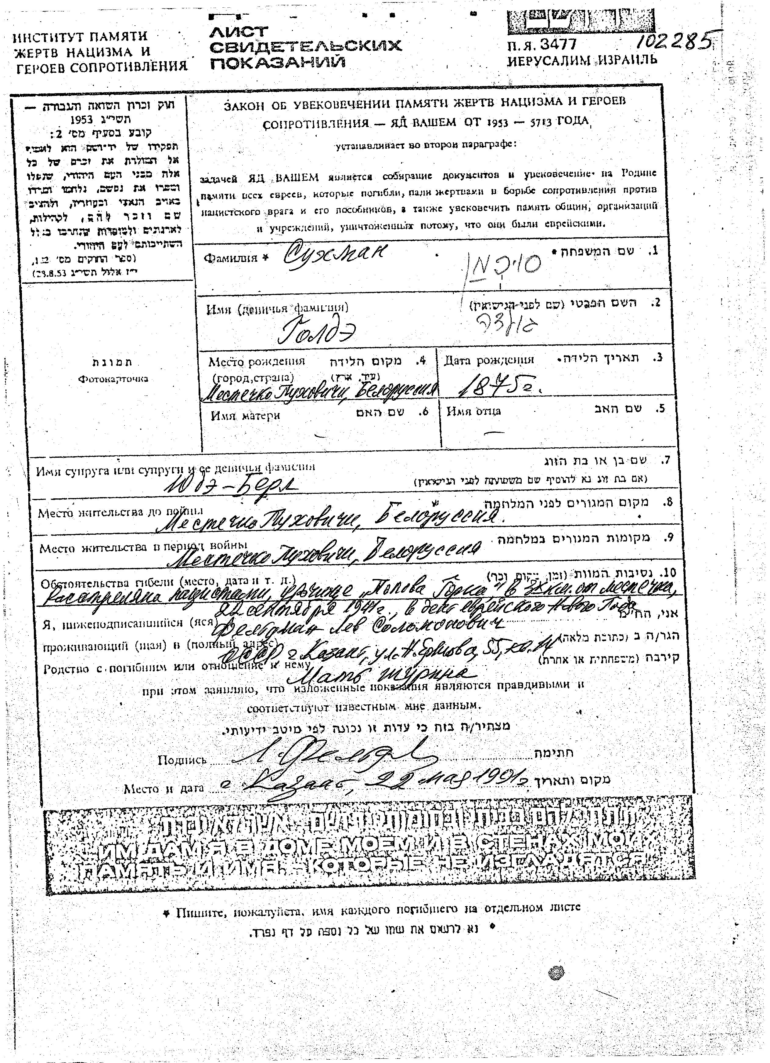 Sukhman Golda 1875 Pukhovichi, Bélorussie (URSS) Feuille de témoignage