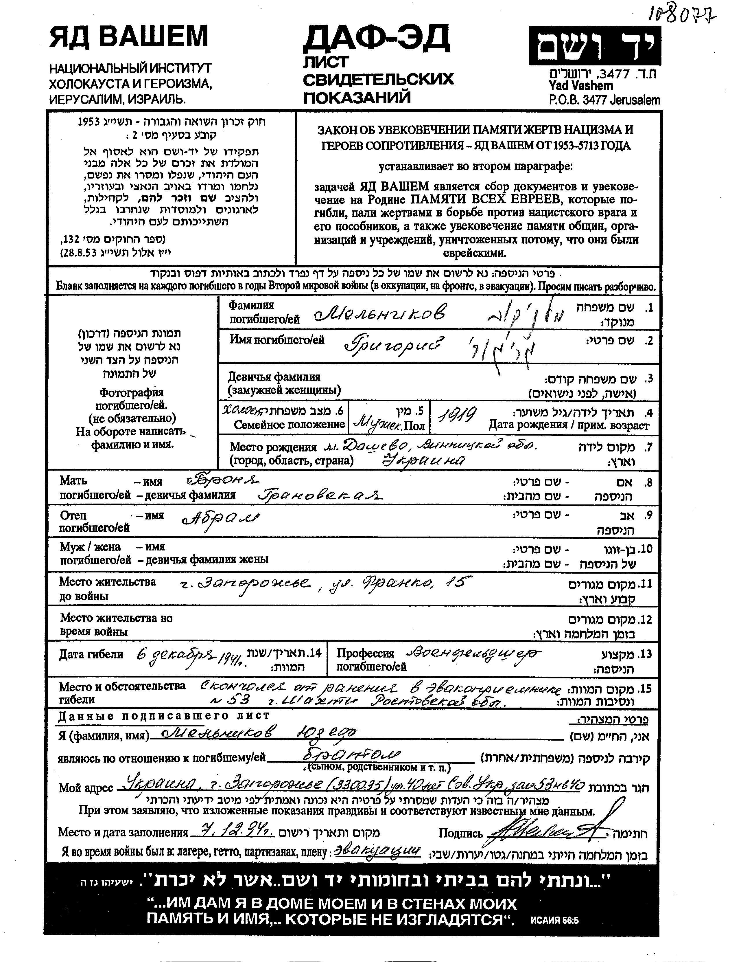 Grigori Melnikov est né à Dashev, Ukraine (URSS) en 1919, fils de Abram et de Bronia née Granovski. Il était Infirmier secouriste et Célibataire. Avant la seconde guerre mondiale il vivait à Zaporozhye, Ukraine (URSS). Au cours de la guerre, il était à the Soviet armed forces. Grigori a été tué en tant que militaire pendant la Seconde Guerre mondiale. Lieu de la mort: Shakhty, Russie (URSS) en 06/12/1941.