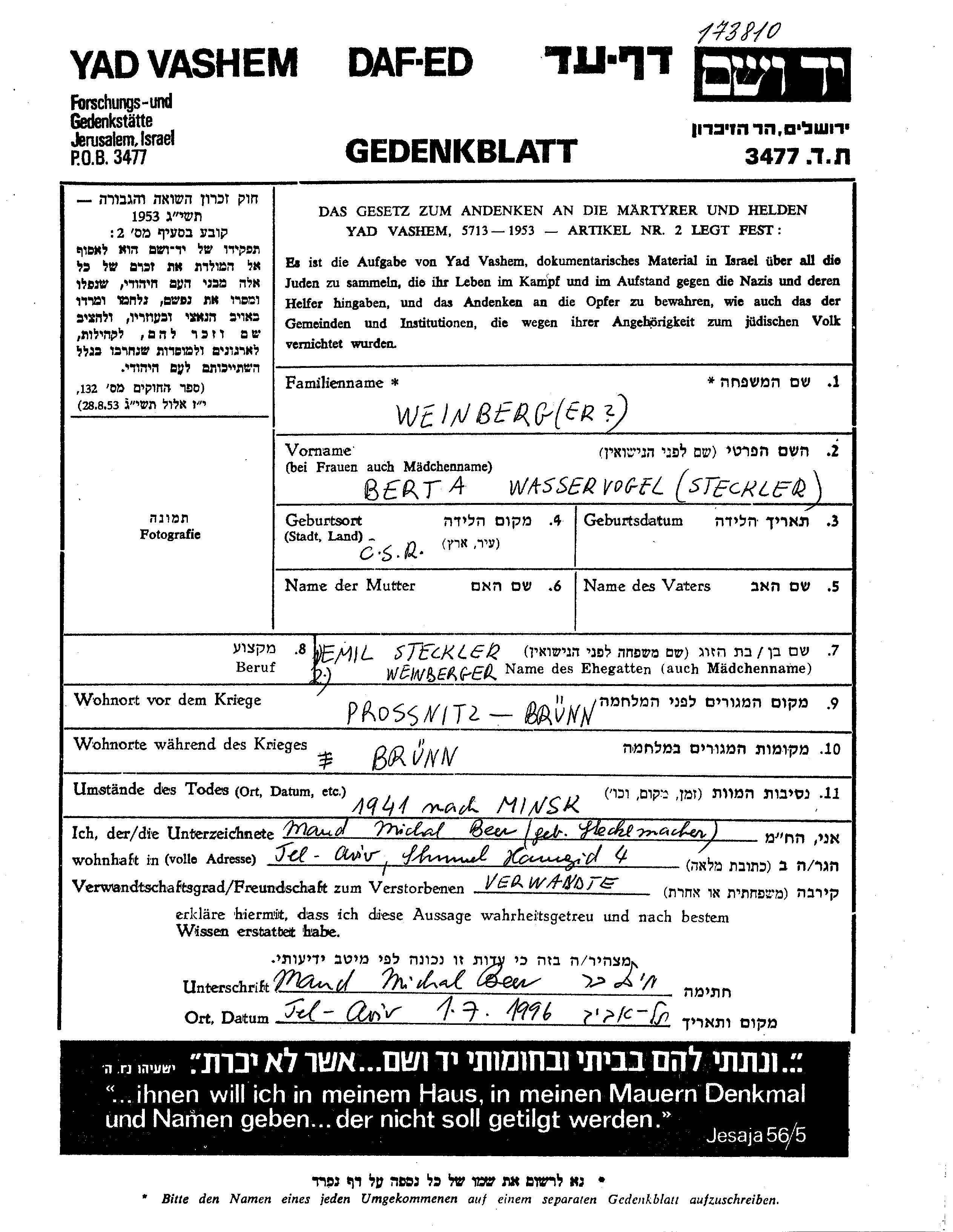 Weinberg Weinberger Berta Prossnitz, Tchécoslovaquie Feuille de témoignage