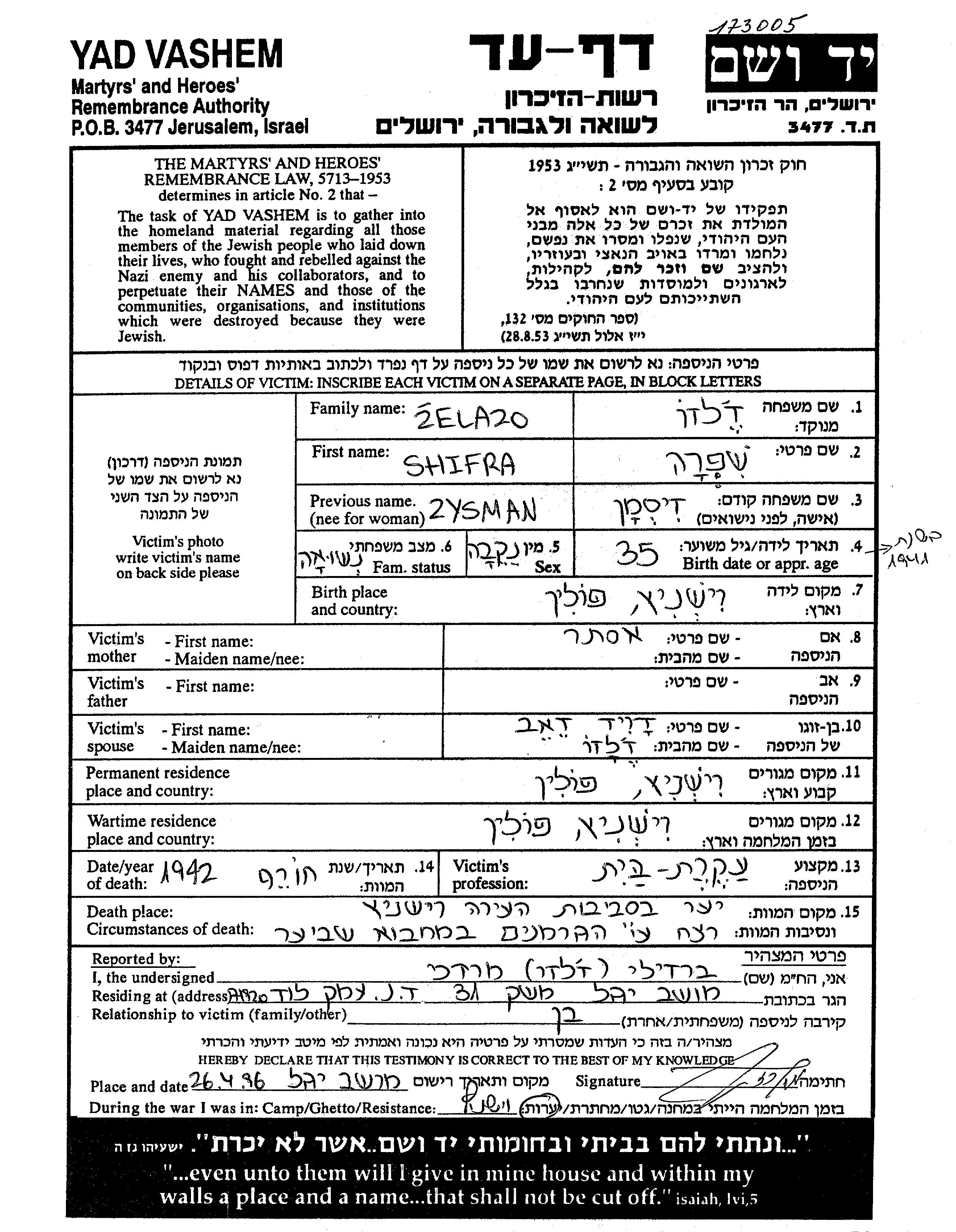 Shifra Zelazo née Zysman est née à Wisznice, Pologne en 1907, fille de Ester. Elle était Femme au foyer et Mariée à David Zeev. Avant la seconde guerre mondiale elle vivait à Wisznice, Pologne. Pendant la guerre, elle était à Wisznice, Pologne.