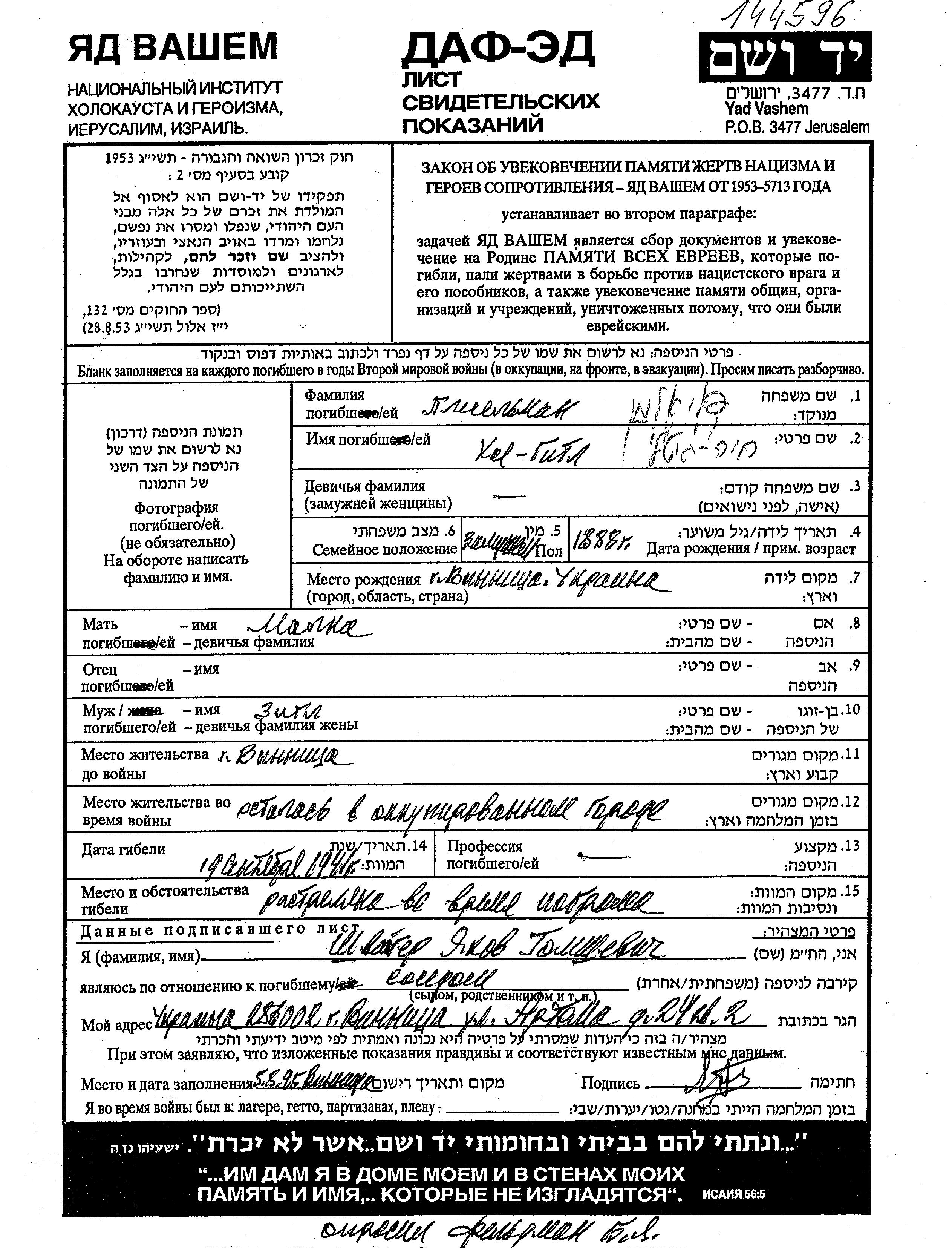 Pliyelman Gitl Khaia 1888 Vinnitsa, Ukraine (URSS) Feuille de témoignage