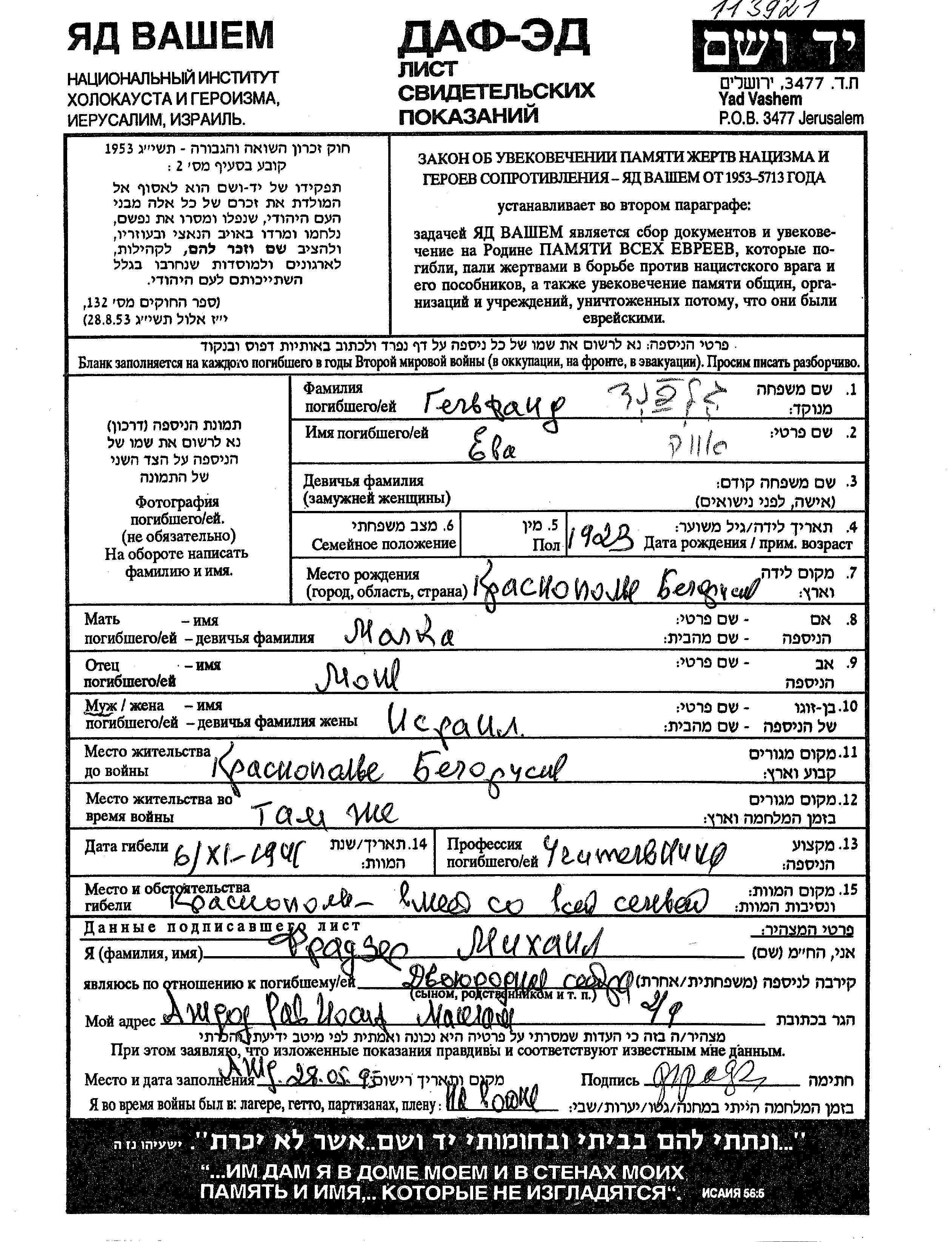 Gelfand Yeva 1923 Krasnopolye, Bélorussie (URSS) Feuille de témoignage