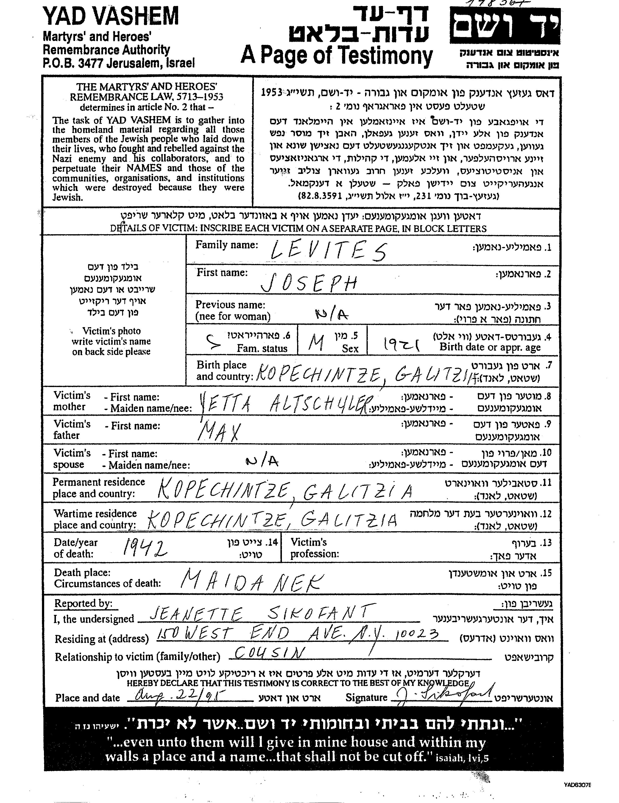 Levitas Joseph 1921 Kopyczynce, Pologne Feuille de témoignage