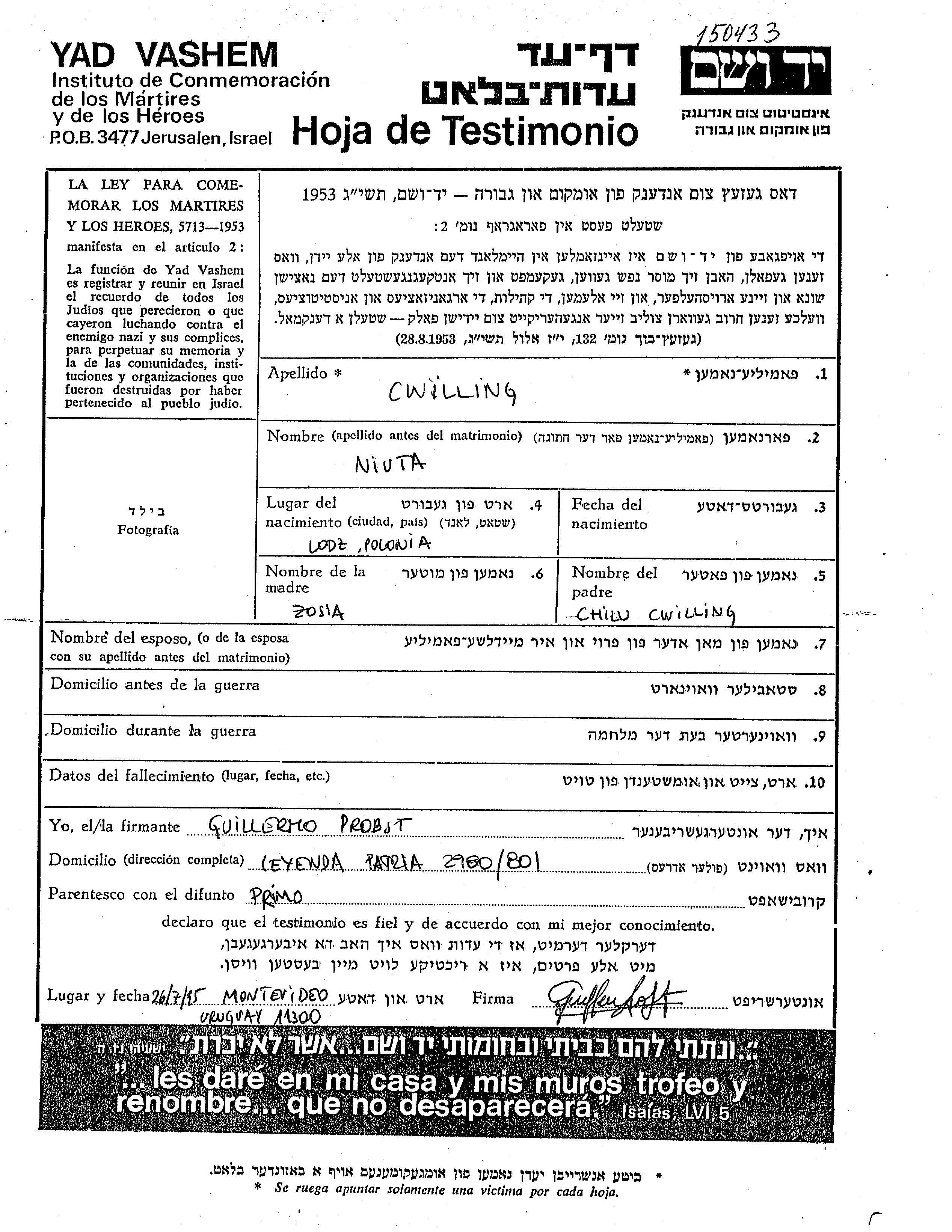 Cwilling Niuta endroit inconnu, Feuille de témoignage