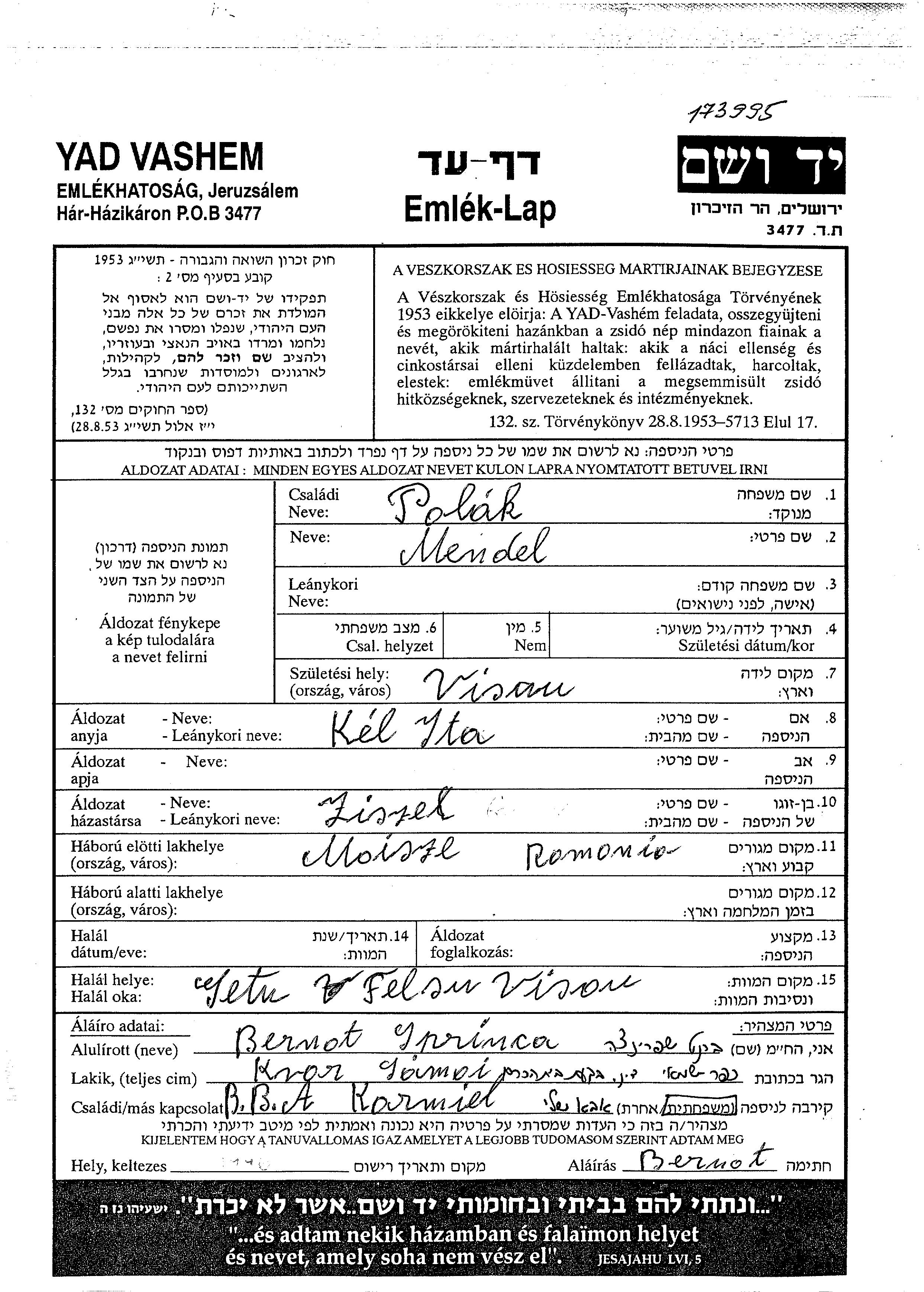 Mendel a été assassiné pendant la Shoah. Lieu de la mort: Felsoviso, Roumanie.