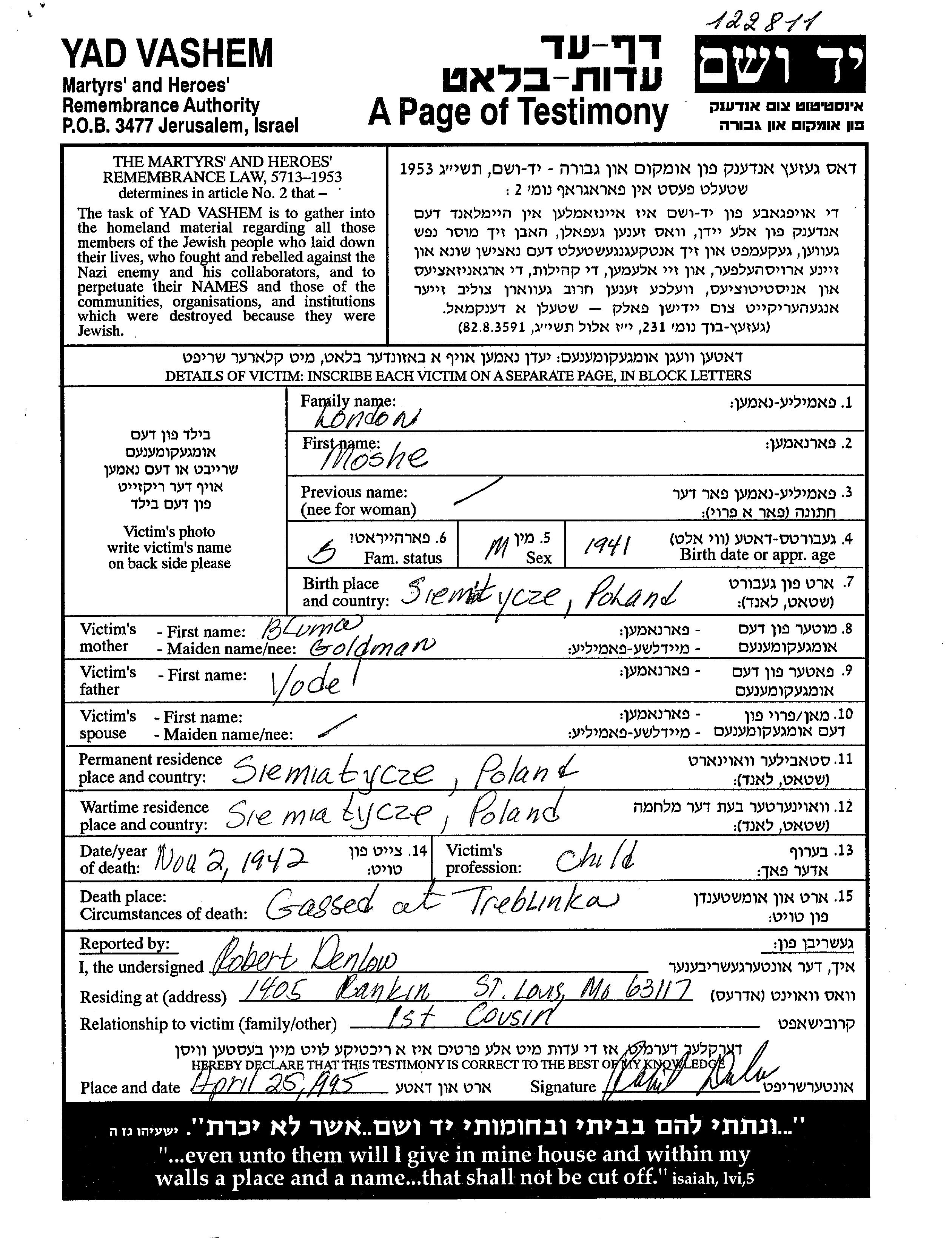 Moshe a été assassiné pendant la Shoah. Lieu de la mort: Treblinka, Pologne en 02/11/1942.
