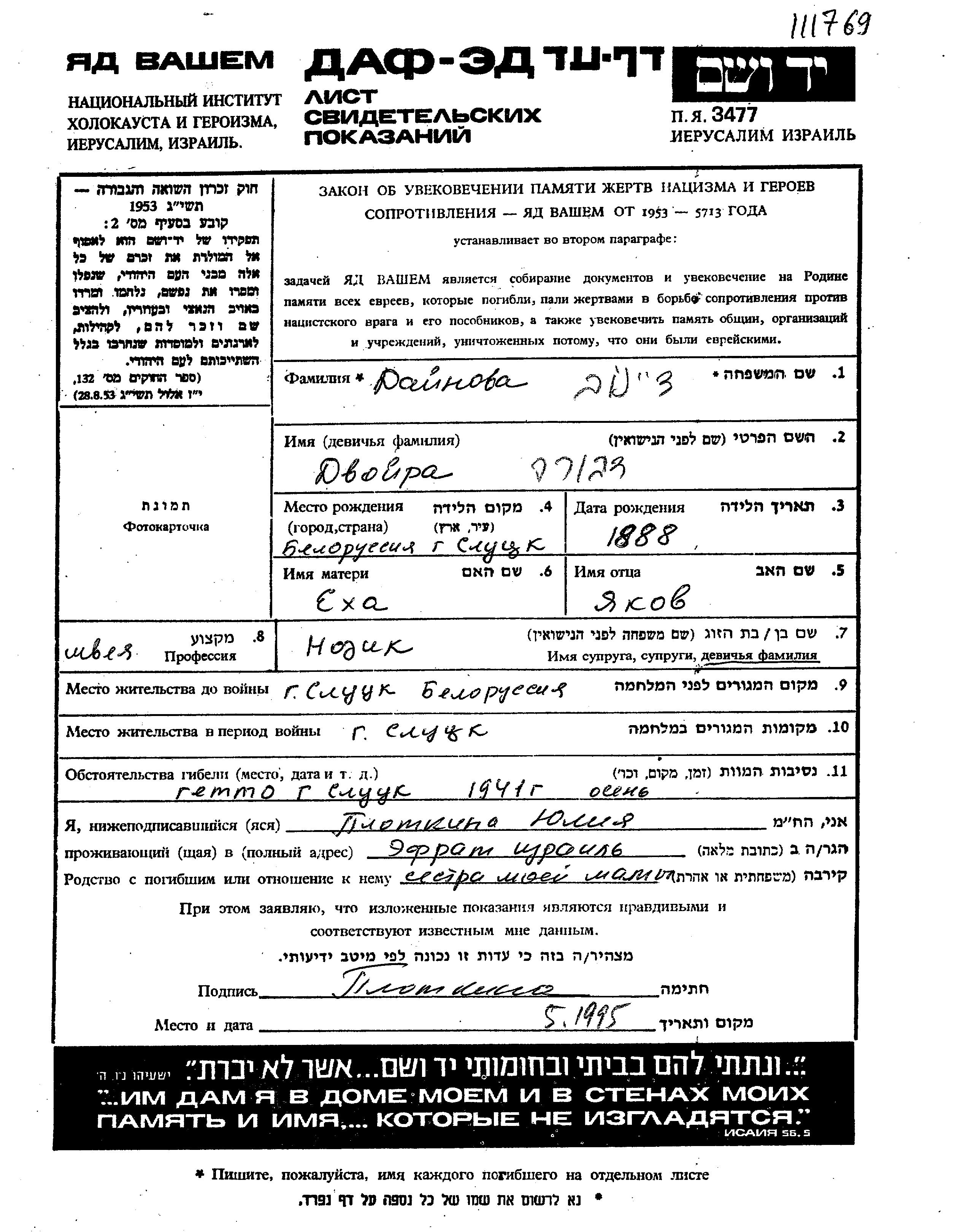 Daynov Dvoira 1888 Slutsk, Bélorussie (URSS) Feuille de témoignage