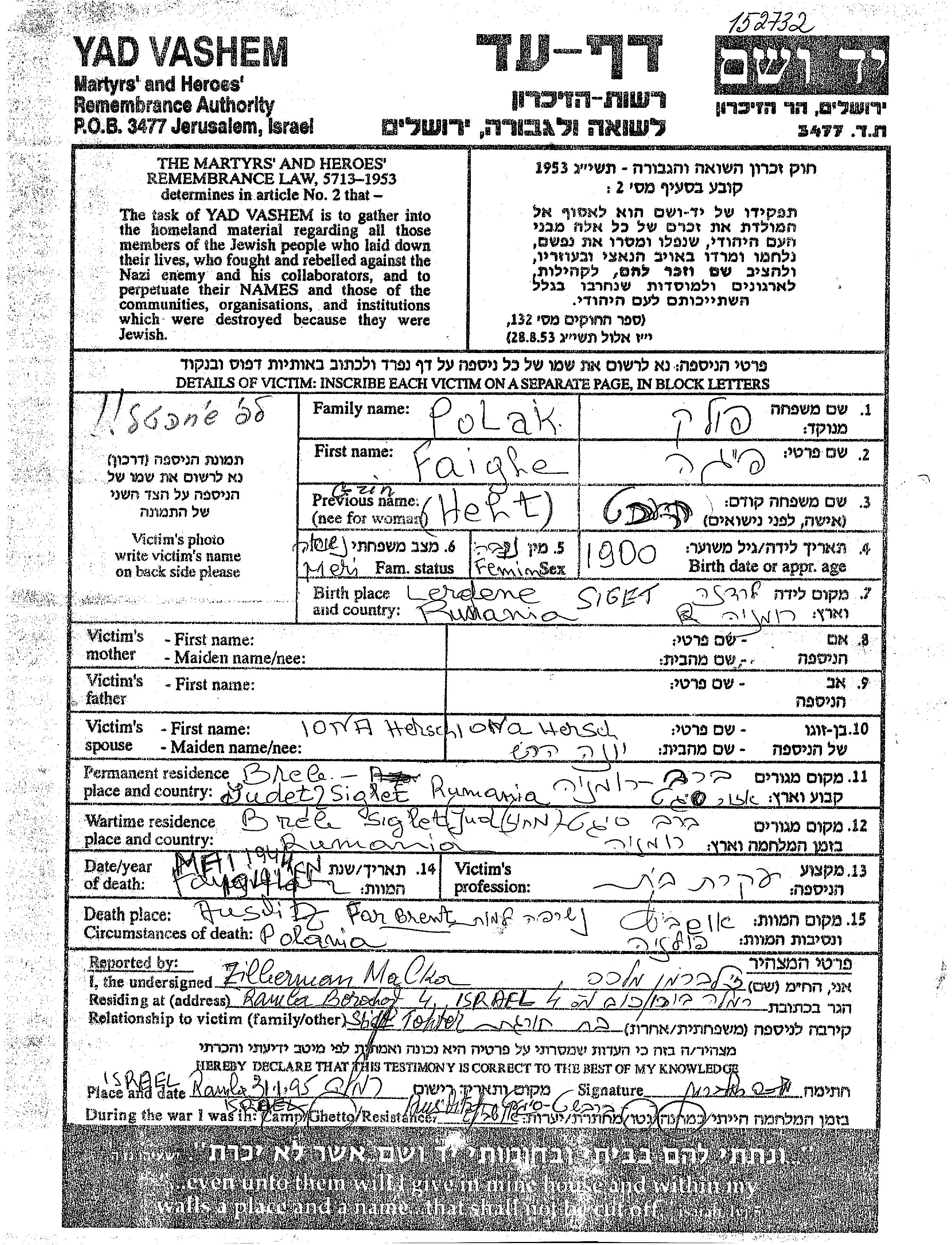 Faighe Polak née Grin est née à Leordeni, Roumanie en 1900. Elle était Femme au foyer et Mariée à Yona Hersch. Avant la seconde guerre mondiale elle vivait à Breb, Roumanie. Pendant la guerre, elle était à Breb, Roumanie.