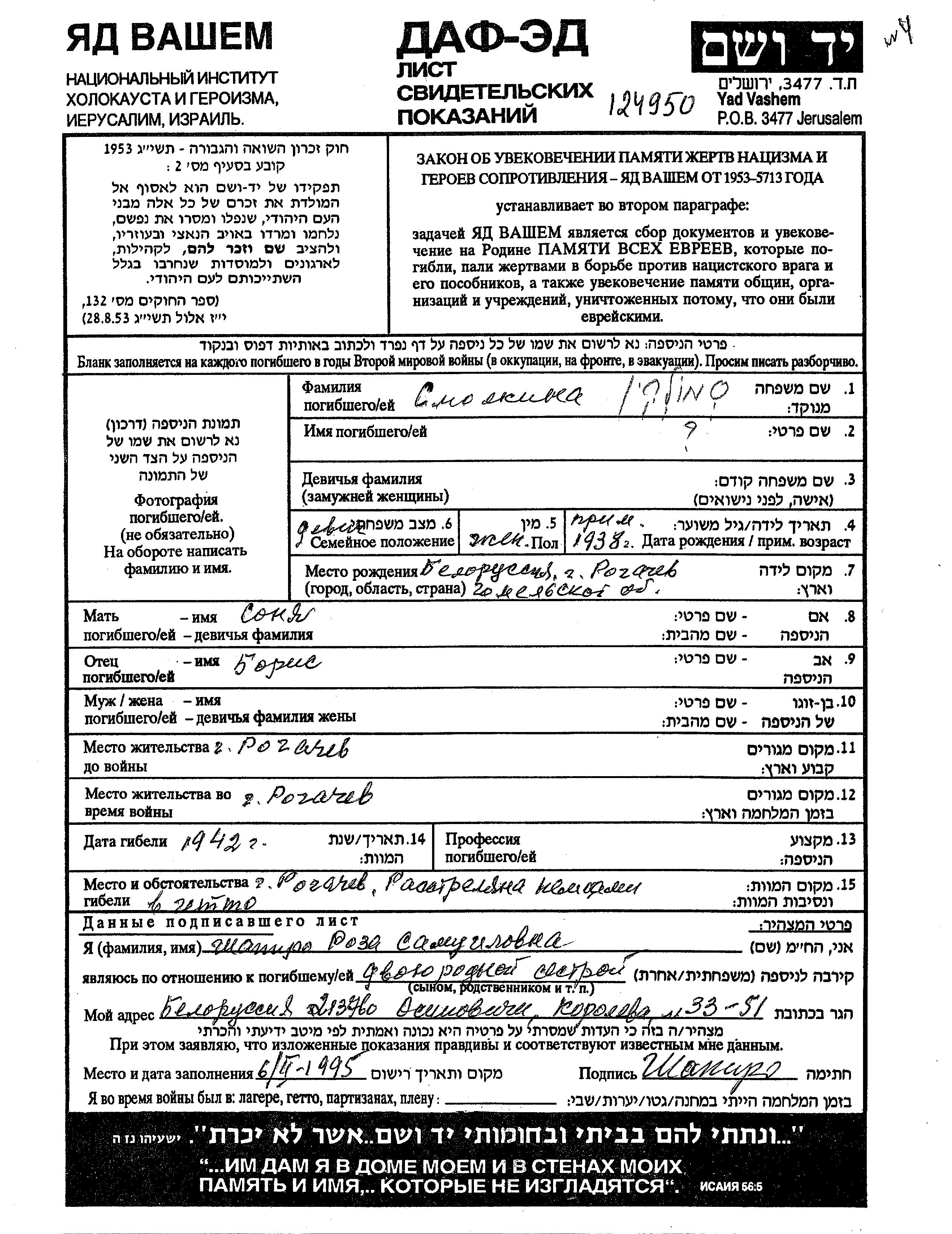Smolkin prénom inconnu 1938 Rogachev, Bélorussie (URSS) Feuille de témoignage