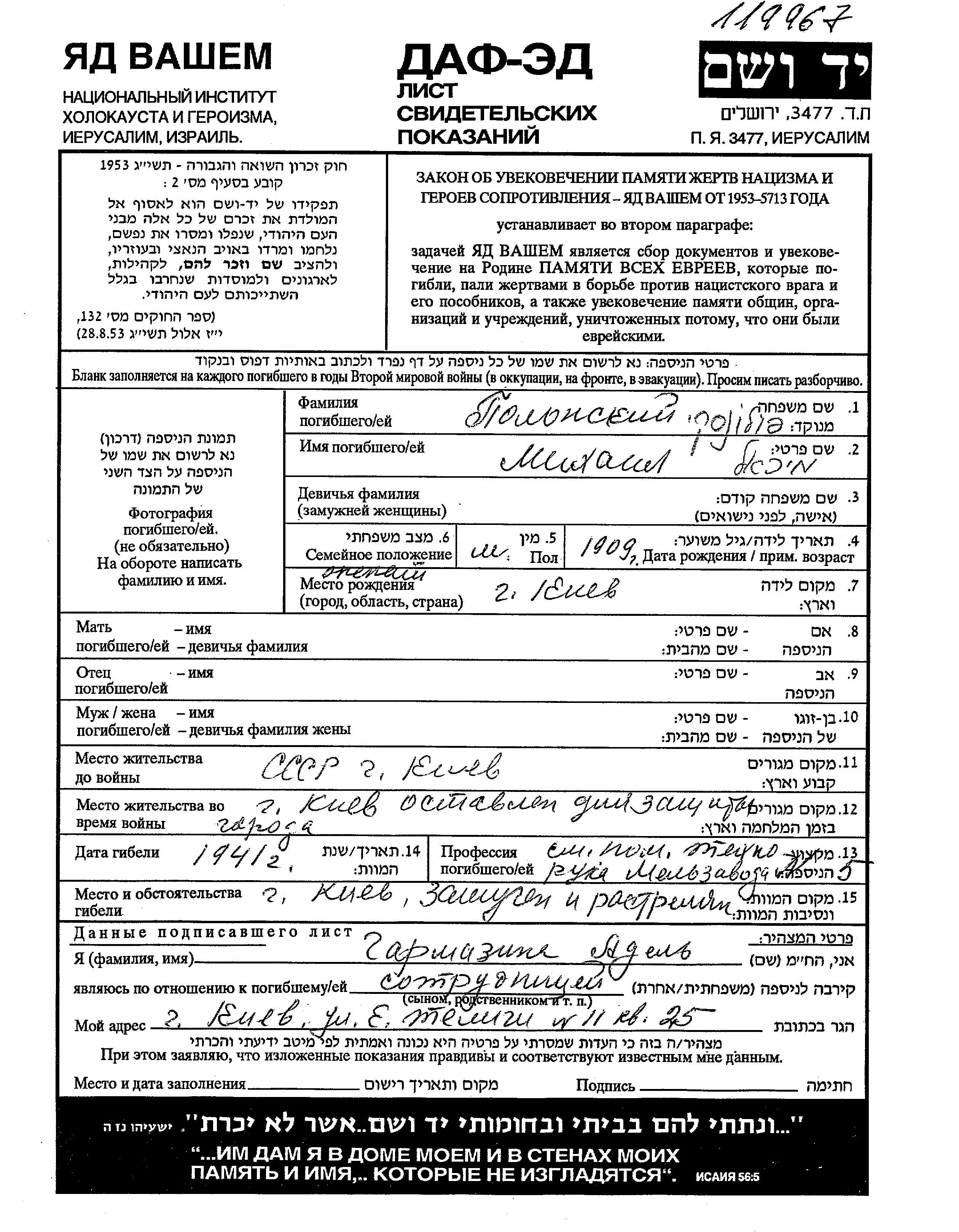 Polonski Mikhail 1909 Kiyev, Ukraine (URSS) Feuille de témoignage