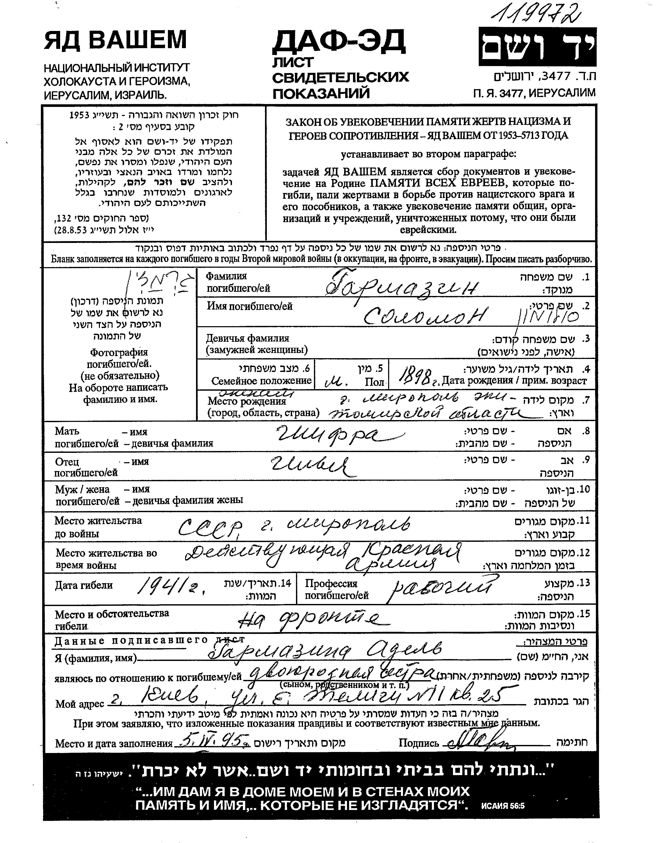 Garmazin Solomon 1898 Miropol, Ukraine (URSS) Feuille de témoignage