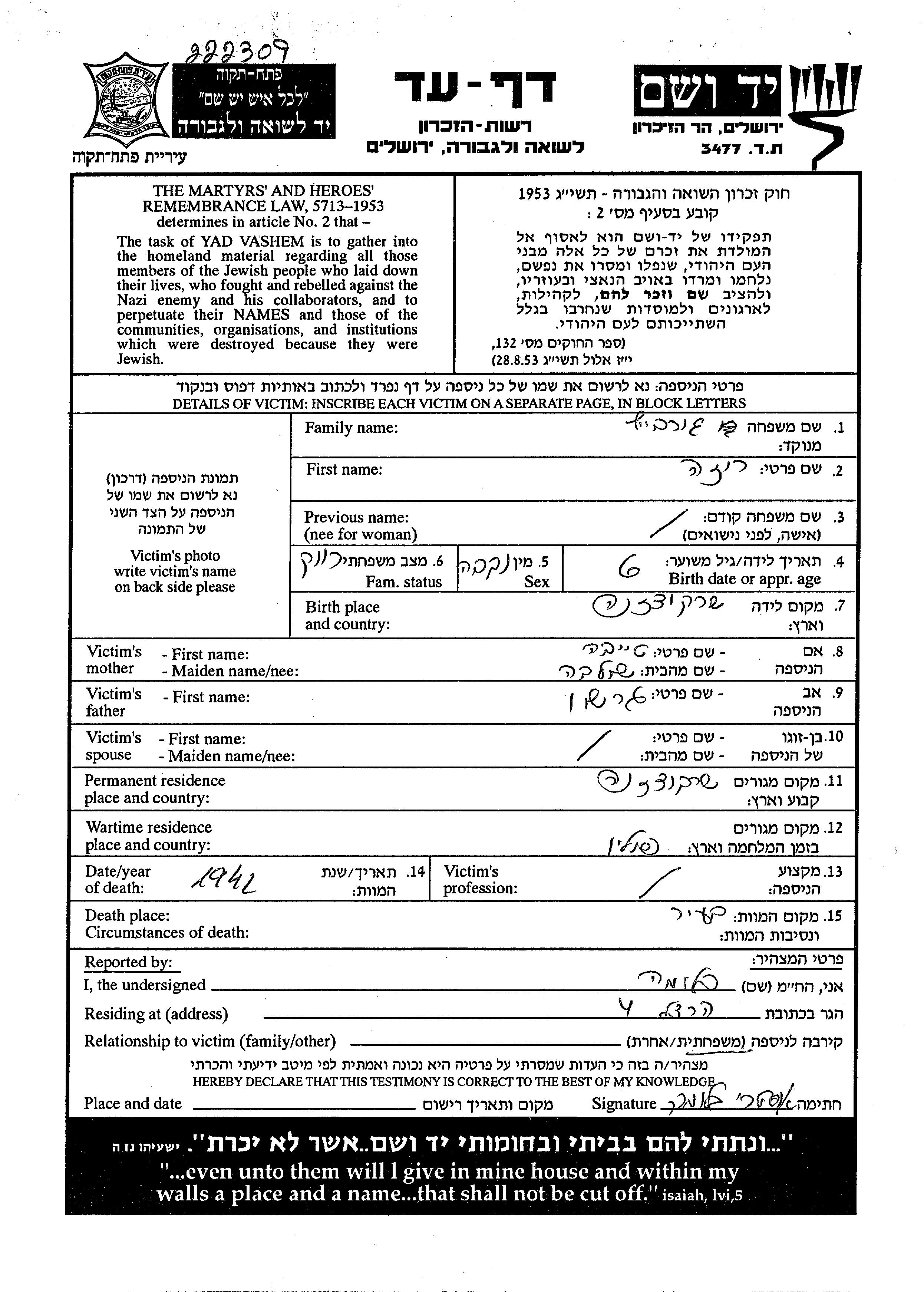 Yad Vashem - Pages of Testimony Names Memorial Collection