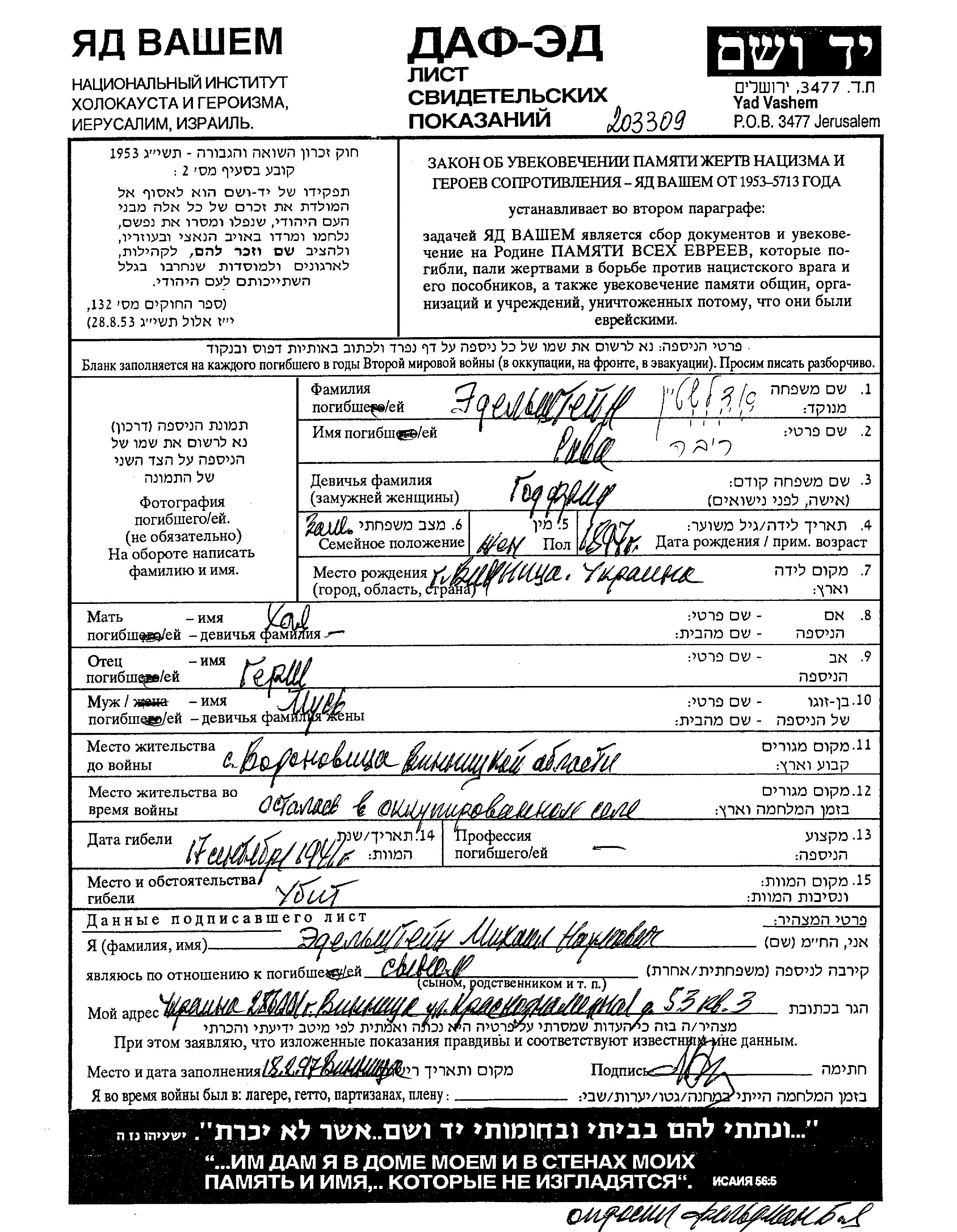 Yad Vashem - Pages of Testimony Names Memorial Collection