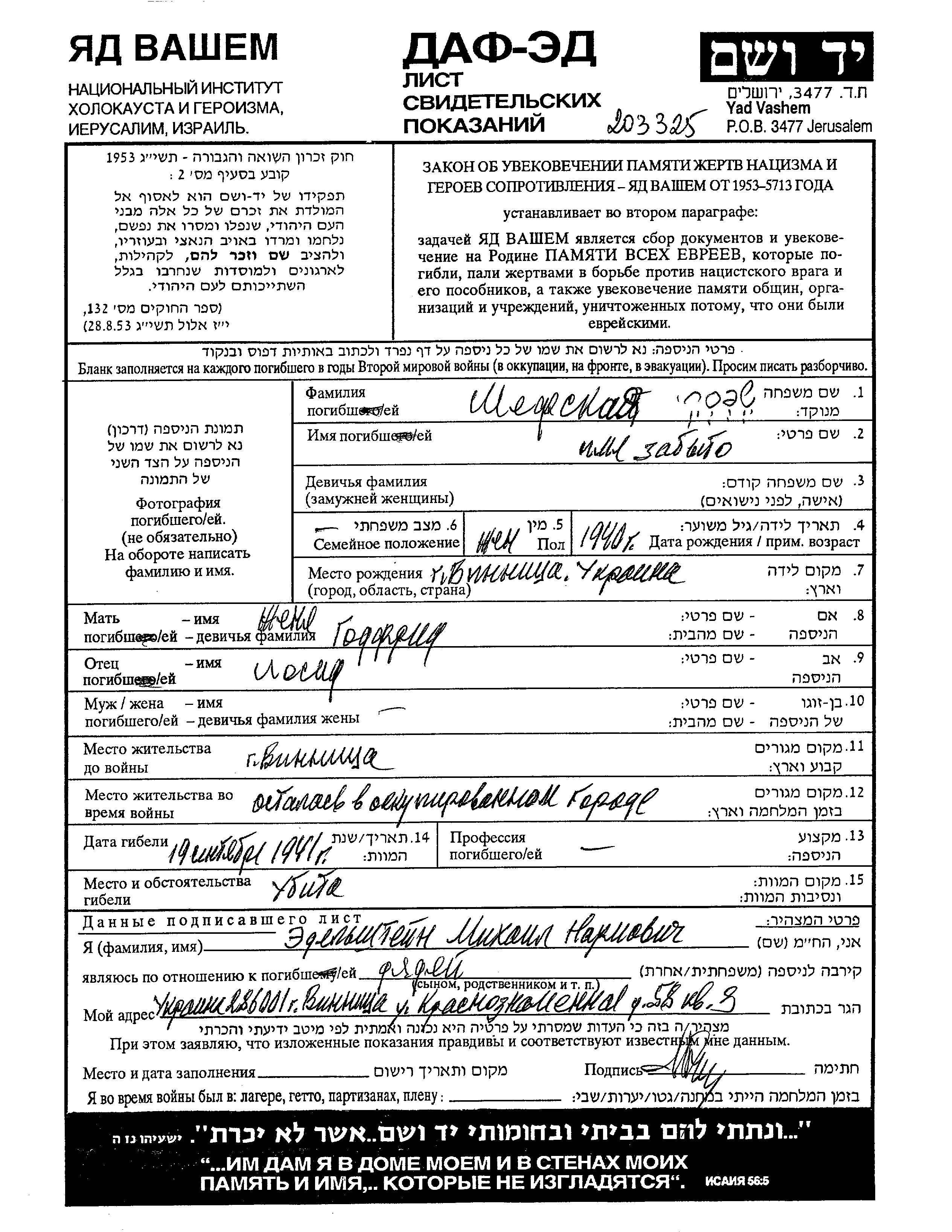 Shefski prénom inconnu 1940 Vinnitsa, Ukraine (URSS) Feuille de témoignage